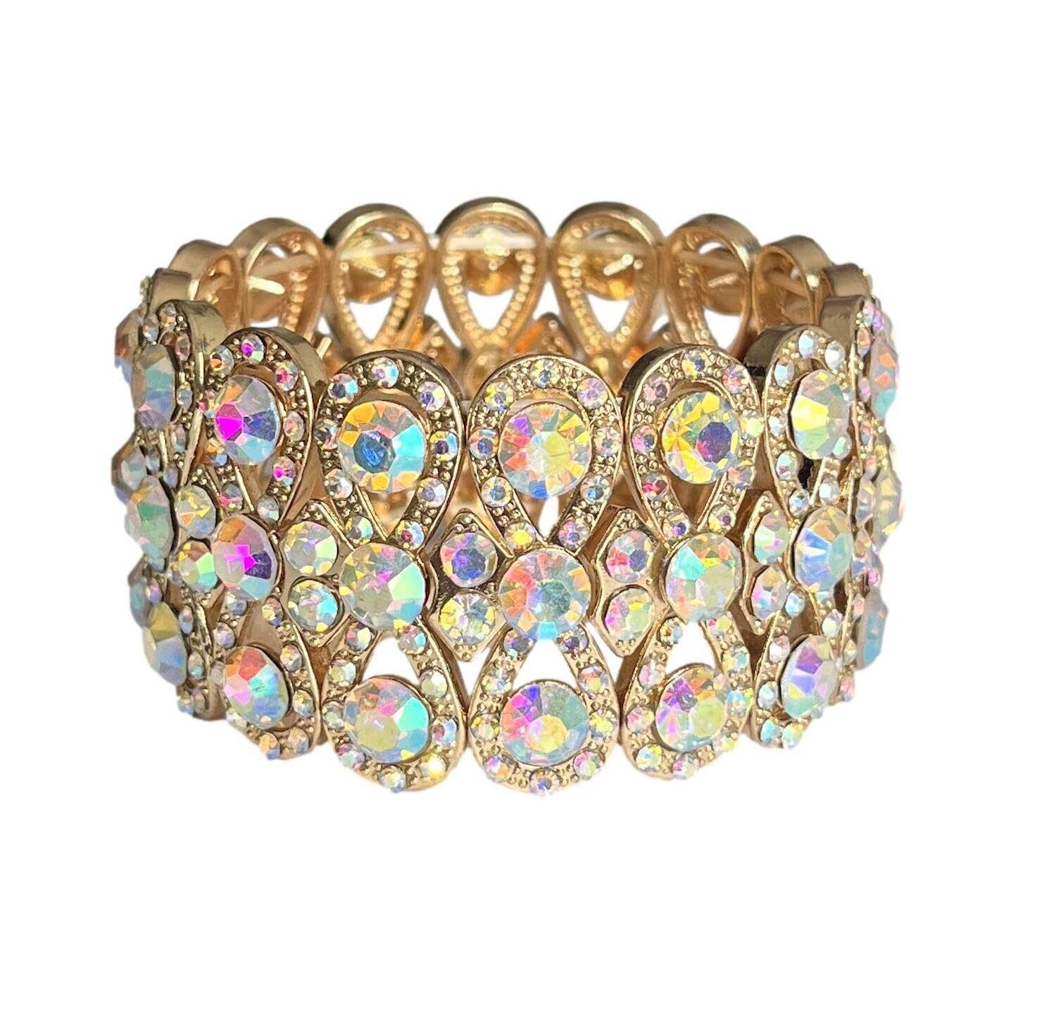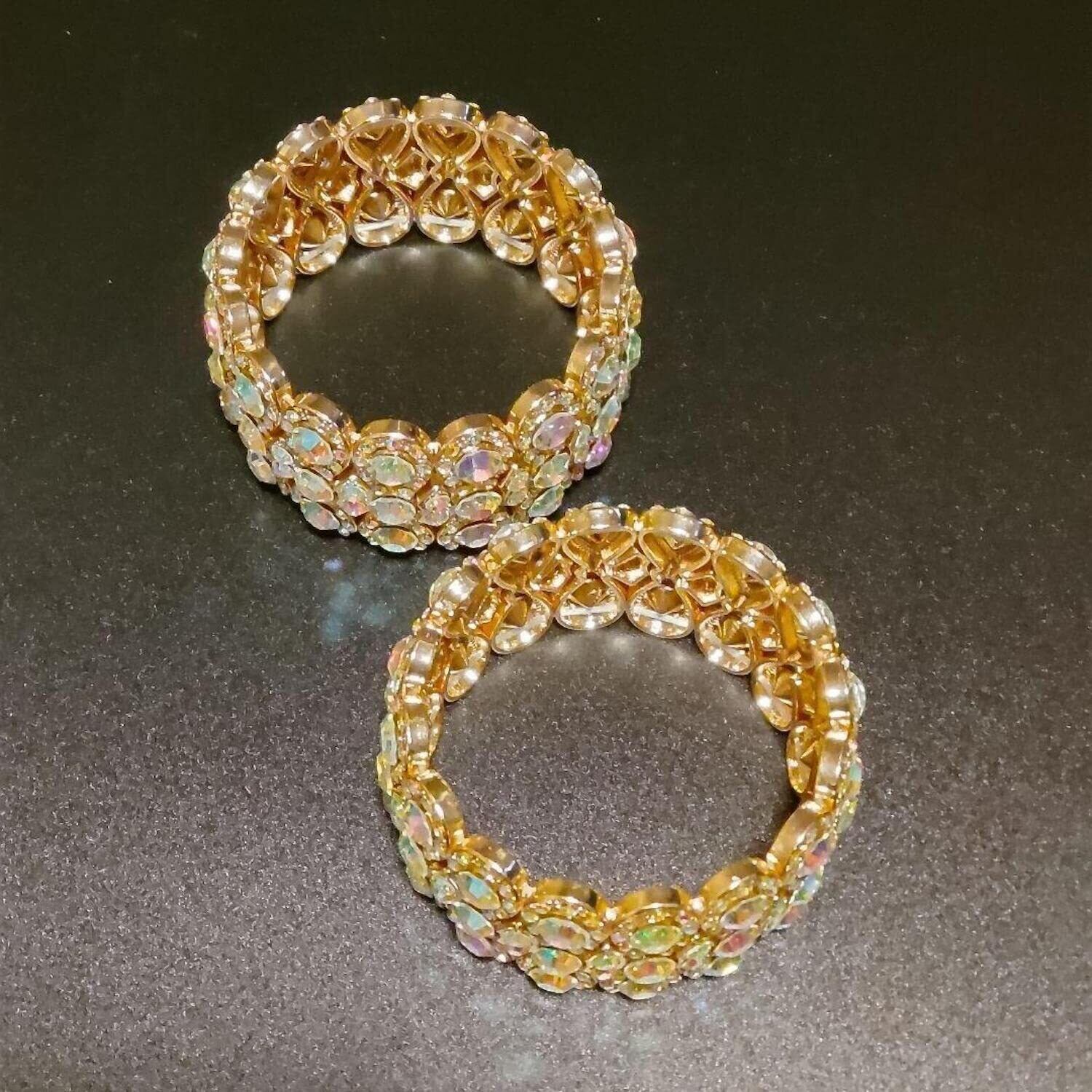 大粒ビジューとラインストーンをふんだんにあしらった高級感あふれるブレスレット2個セット。 眩いばかりに煌く上品な雰囲気はあらゆるパーティ・フォーマルシーンであなたの装いをより一層演出し輝かせます。