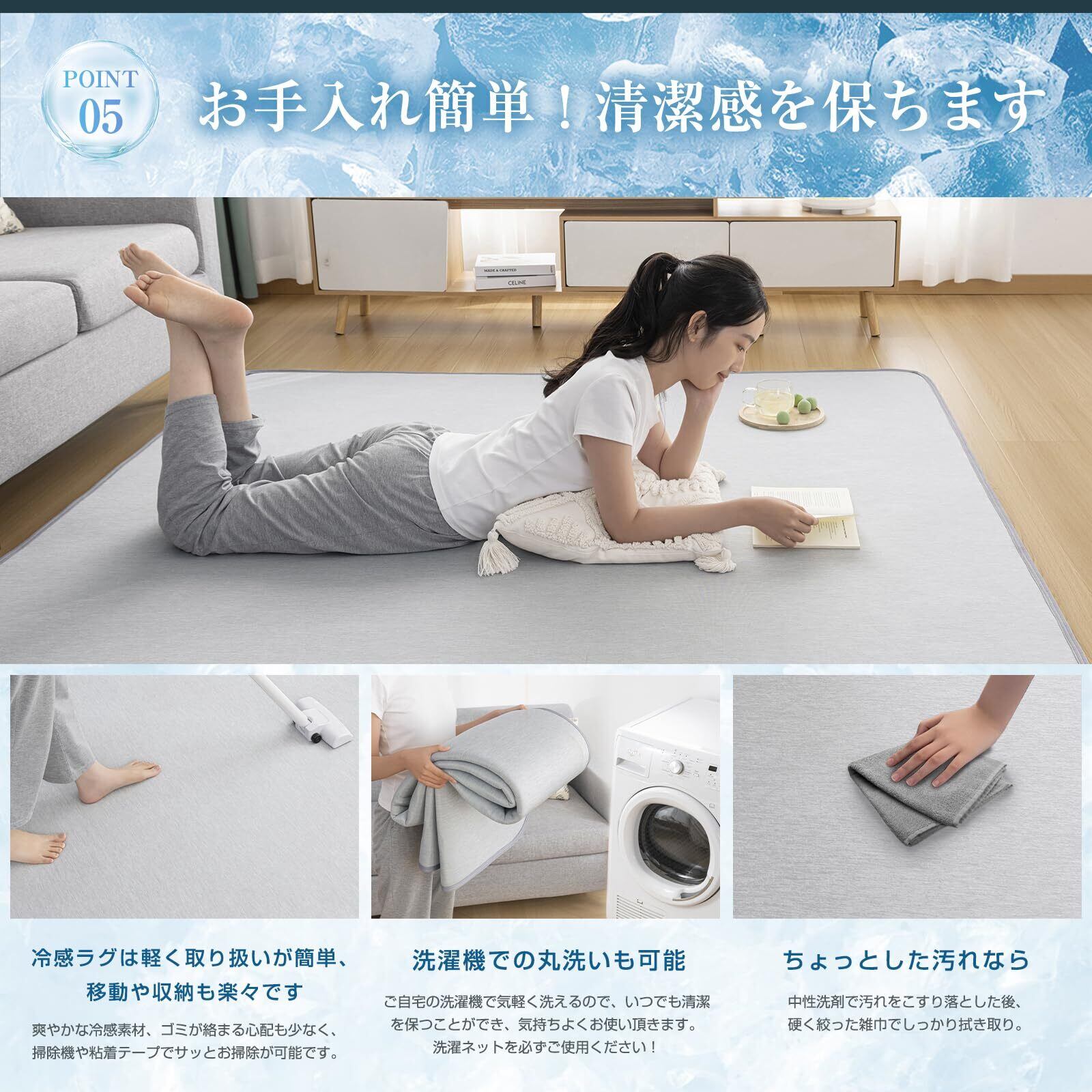 【強クール接触冷感ラグ】 Sun Deco冷感ラグは基準値の2倍ひんやり高品質の冷感素材を使用しており、夏の暑い日でもひんやりとした感触を提供します。特殊な繊維技術により、長時間冷たさを持続させ、快適な室内環境を維持します。特に、エアコンや扇風機と一緒に使用すると、冷感効果がさらに高まります。暑さが厳しい日本の夏に最適で、リビングや寝室での使用にぴったりです。