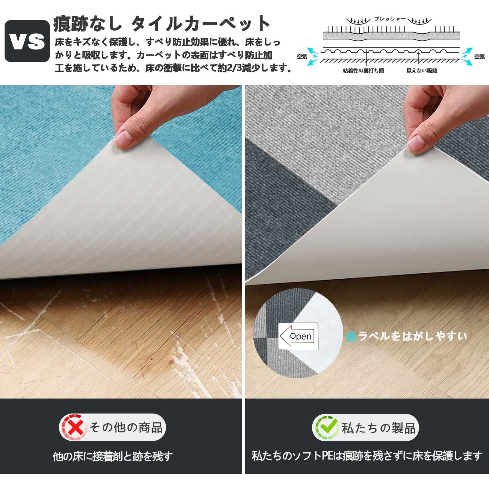 防音・足の感覚を改善 ---- カーペットのフットフィールは快適であり、木質床、大理石、セラミックタイルなどの床材は寒くて、多い湿気で、不快感を感じるため、この問題をうまく解決することができます。刺激臭がなく、お年寄りやお子様にもやさしく、吸着性に優れていますので、ご安心ください。 犬や猫でさえ簡単に取り除くことはできません。
