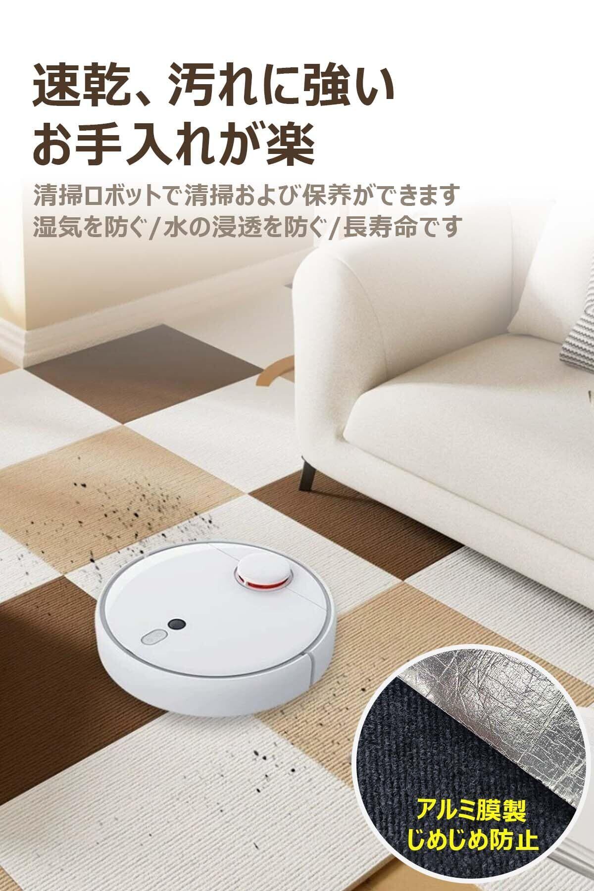 【取り付けが簡単・手入れが簡単・DIY可】タイル敷きか取り付け時に背面を床に贴りつけるだけで簡単に取り付け完了です。リンサークリーナーで清掃を行うとすぐに乾燥します。このタイルカーペット必要に応じて、任意にカットしてお使いいただけます。