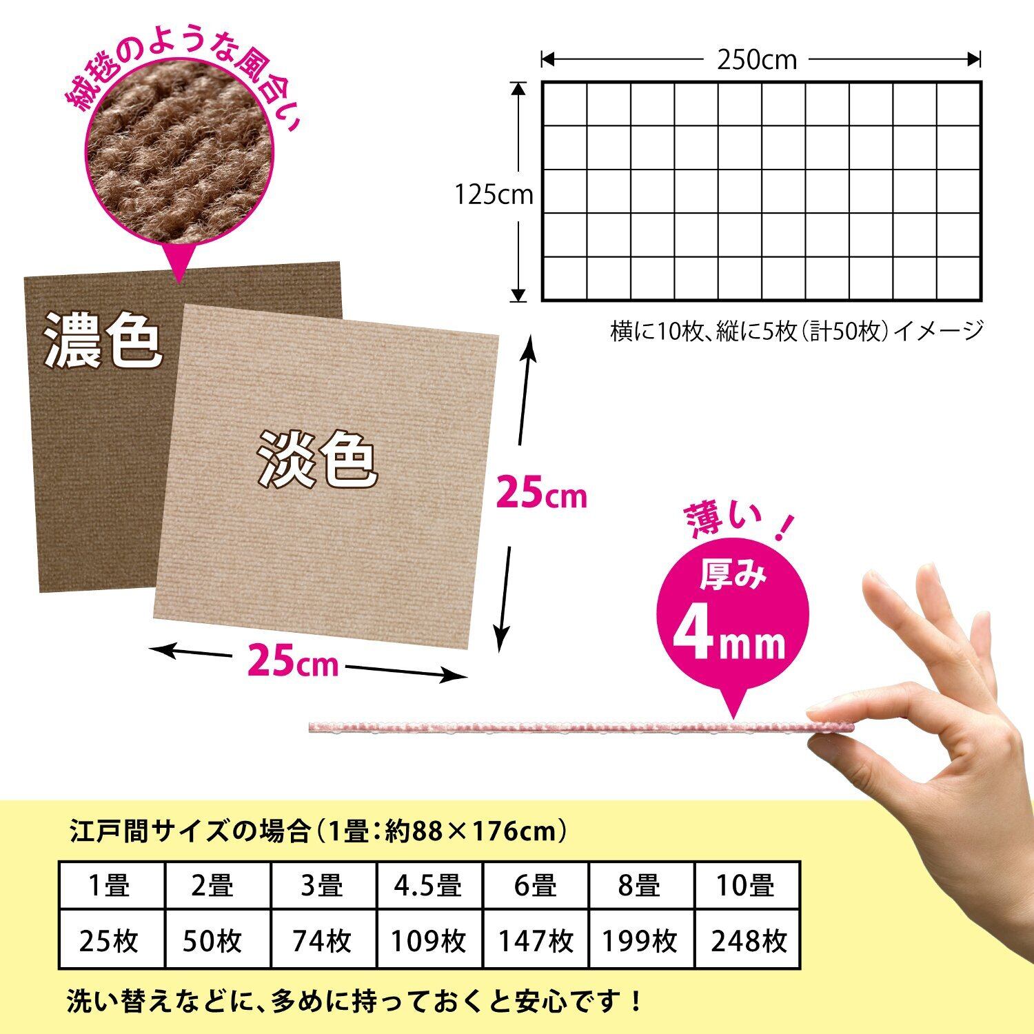 【2畳分】サイズ : 50枚組〈約3㎡〉(2色組、各25枚)25×25cm(厚み4mm)、重量:37g(1枚)