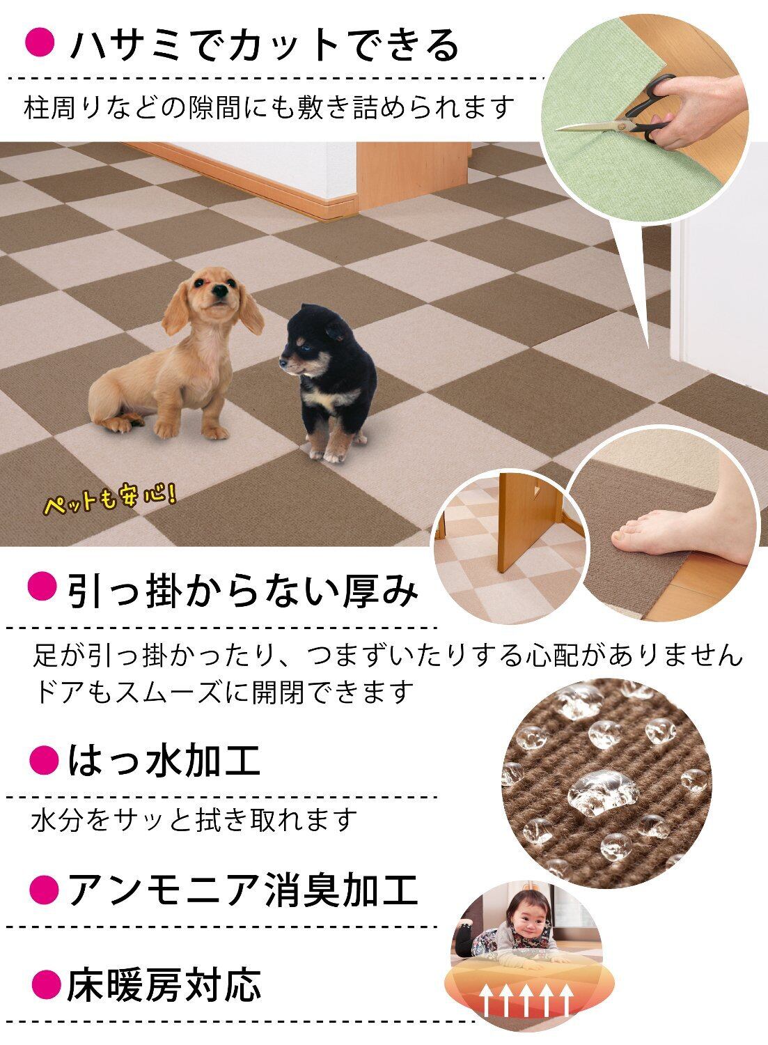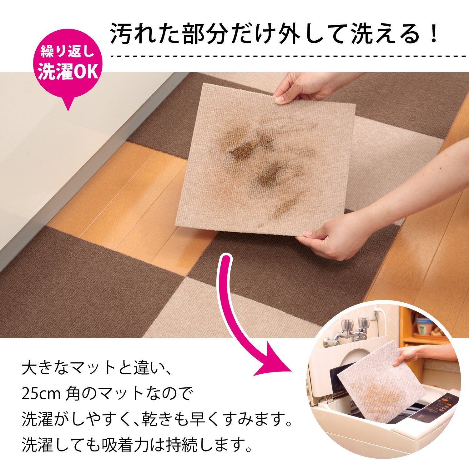 おくだけで取り付け、取り外しも簡単なタイルマット。生地が薄いので、つまずきにくく、扉の開閉の妨げにならないので小さなお子様や車椅子のお年寄りの方にもお使い頂けるバリアフリータイルマットです。スペースに合せて組合せ自由に敷いて頂けます。裏面は吸着加工で掃除機を使っても吸い上がらないから、お掃除もラクラク。汚れたマットだけお洗濯できます。ハサミで手軽にカットでき、カットしてもほつれません。1枚25cm角でブラウンとライトブラウンの50枚セットです。