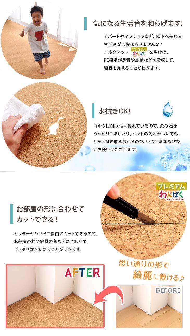 ※従来のコルクマットと色味・サイズが異なります。 追加購入の方は、ご注意ください。 ※コルクは天然素材のため性質上粉が生じたり欠けたりする場合がございます。その場合、 掃除機で吸い取るなどのお手入れが必要となりますので、予めご了承ください。 ※マットの上での暖房器具の使用はおやめください。 ※汚れた場合は固く絞った雑巾で拭き取ってください。水分が隙間に入り込んだ場合はカビ発生の原因となる場合がありますので、定期的にマットを剥がして掃除してください。匂いが気になる場合は、風通しの良いところで干してください。
