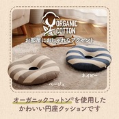 【在庫処分】イケヒコ クッション オーガニックコットン 円座 フロー 穴あき ベージュ 約35cm丸 手洗い インド綿 ボーダー 日本製 通年 オールシーズン #1210880020401