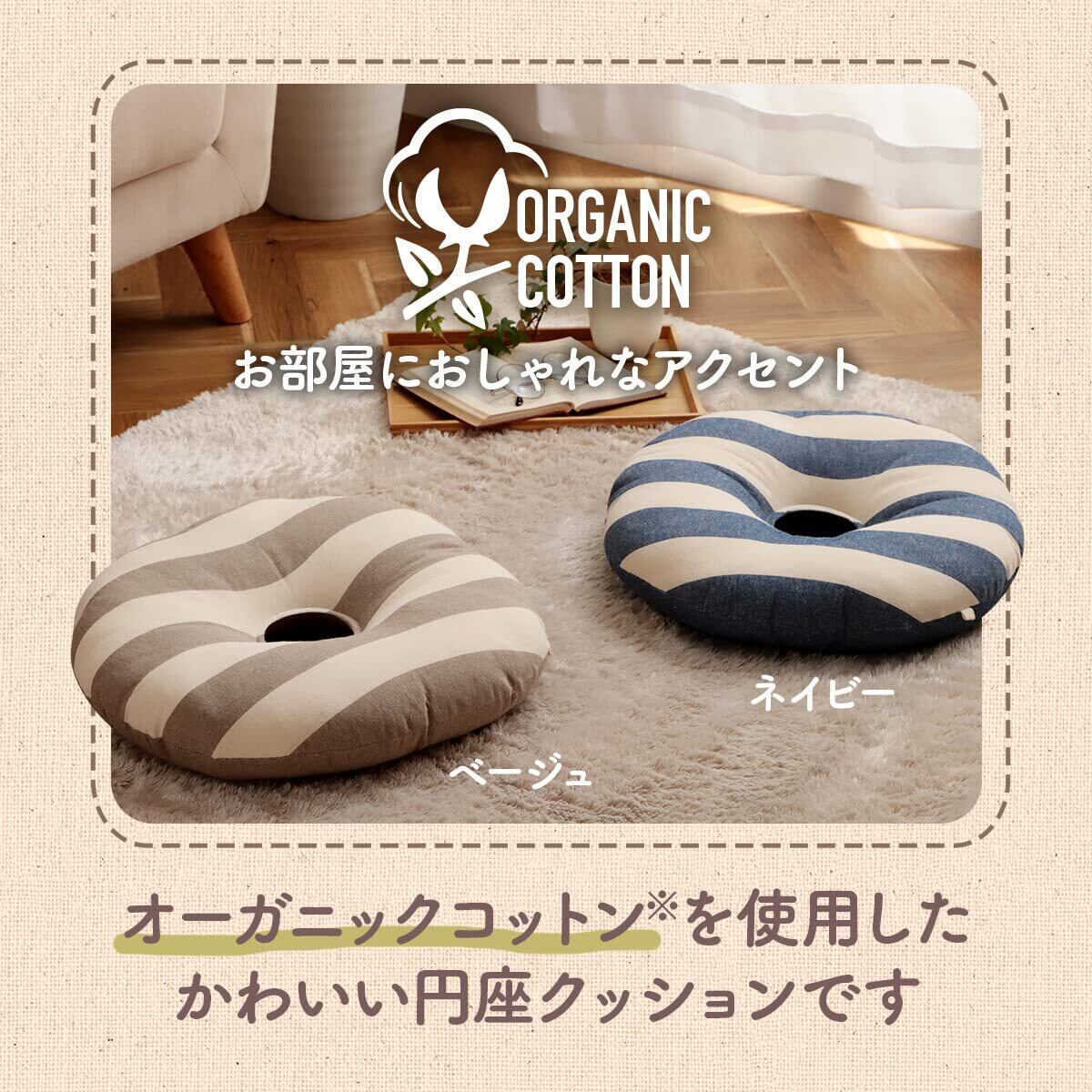 イケヒコ クッション オーガニックコットン 円座 フロー 穴あき ベージュ 約35cm丸 手洗い インド綿 ボーダー 日本製 通年 オールシーズン #1210880020401