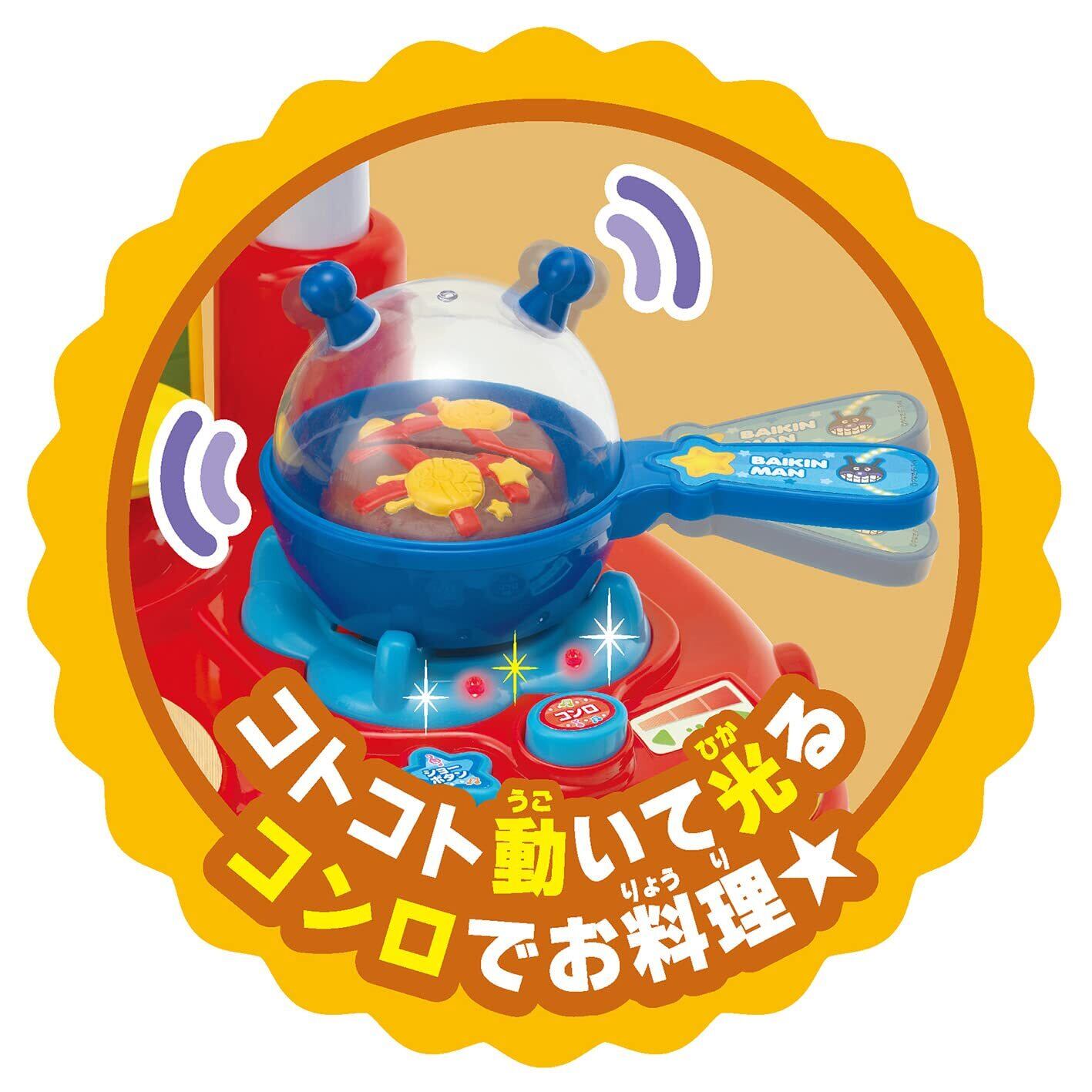 「アンパンマンのマーチ」のメロディが流れ、アンパンマンとお皿のステージが動き、コンロが動いてピカピカ光ります。
