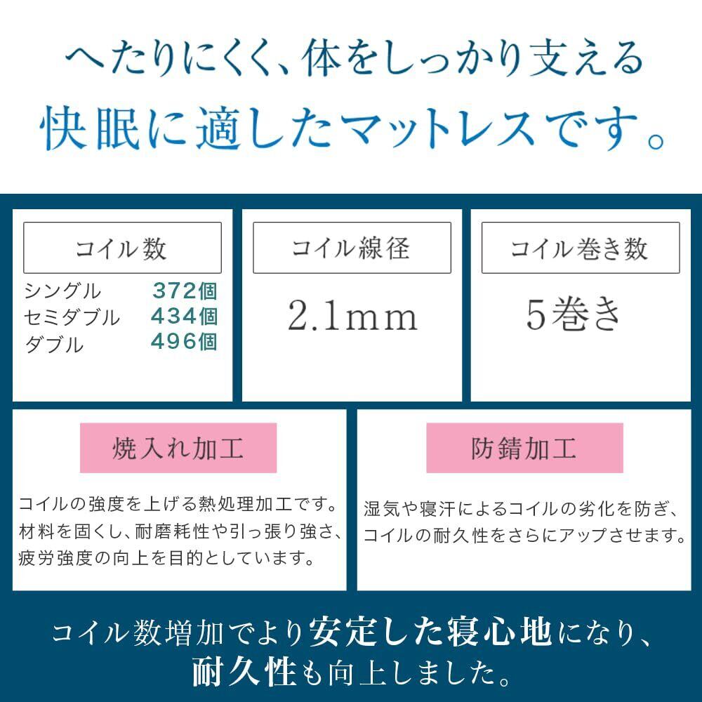 【備考】 ※マットレスの上で飛び跳ねたりしますと、コイルの破損や怪我の原因になりますので、お避け下さい。 ※マットレスは柔らかい素材で作られてますので、保存期間中の置き方や運搬の仕方、また測り方によって多少サイズに誤差が生じる場合がございます。予めご了承下さい。。 ※モニター画面の設定、または解像度などにより現物と色・質感が若干異なって見える場合がございます。 ※2024年10月4日より、【厚み17cm】タイプの販売を終了しました。