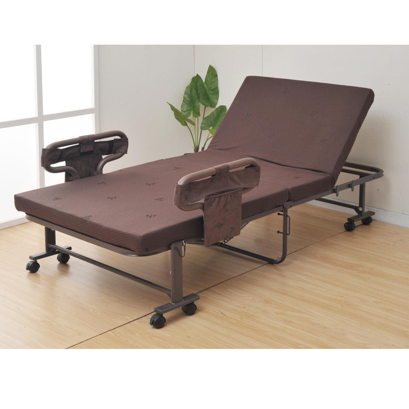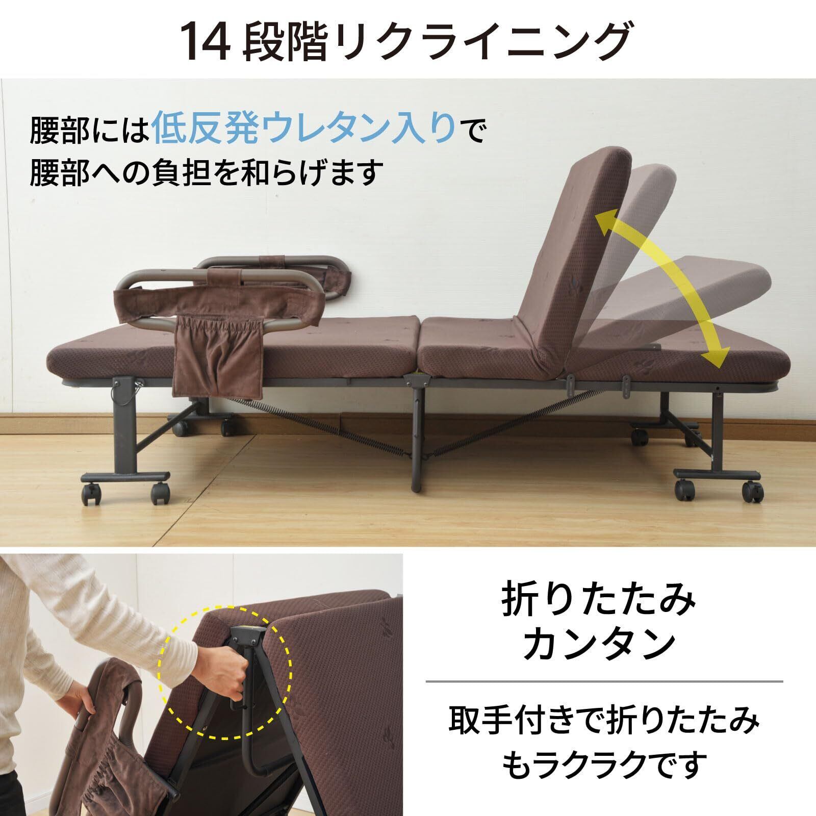 山善(YAMAZEN) 折りたたみベッド シングル 腰部低反発 大きめ手すり(立ち上がりやすい) 14段階 リクライニング 収納ポケット 高床(43㎝) 組立かんたん ダークブラウン BAS-1S(DBR)RGT