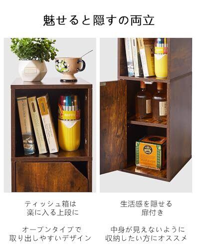 魅せると隠すの両立:上段はラフに文庫文・ティッシュ箱が入れられるオープンな収納スペース。下段は可動棚で、収納したい物に合わせて三段階調節でき、高さのある置物も置けます。さらに扉付きで、生活感を抑えたスッキリ見た目のサイドテーブルとしてお使いいただけます。「見せる」と「隠す」の二種類の収納で、スッキリ片付いた素敵な空間に。