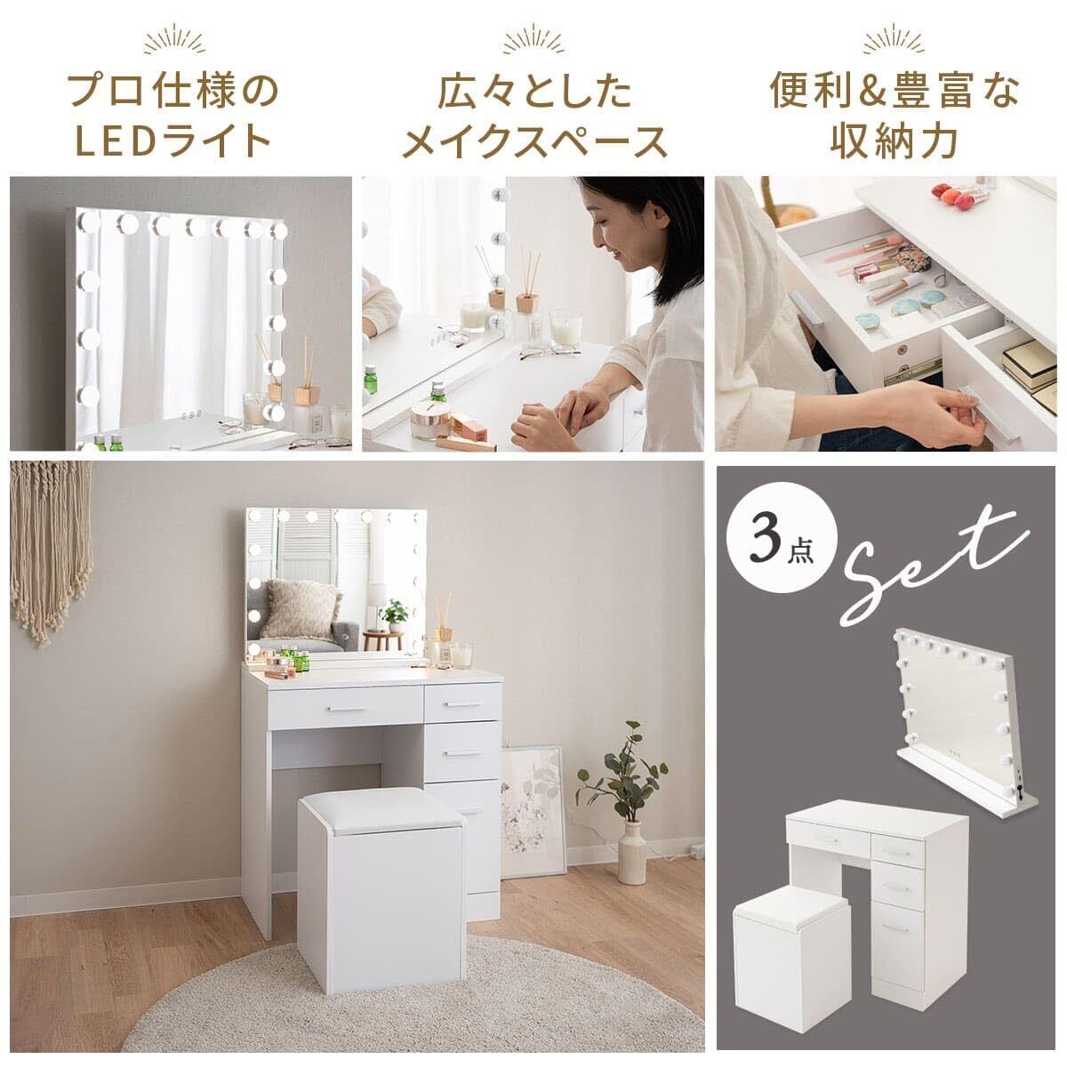 <ドレッサー&スツールセット>POINT①幅約70cmのスリム設計なので一人暮らしのお部屋や、リビングのちょっとした隙間に置けます。コンパクトながら、メイクスペースは広々とした設計です。 POINT②大きさや深さの異なる引き出しが4つもついた大容量収納。メイクセットはもちろん、ドライヤー、ヘアアイロン、美顔器などもすっきり片づけられます。 POINT②スツールはデスクにすっぽり収納でき、使わないときも邪魔にりません。スツールの中にも収納付きで、お部屋のスペースを有効活用できます。