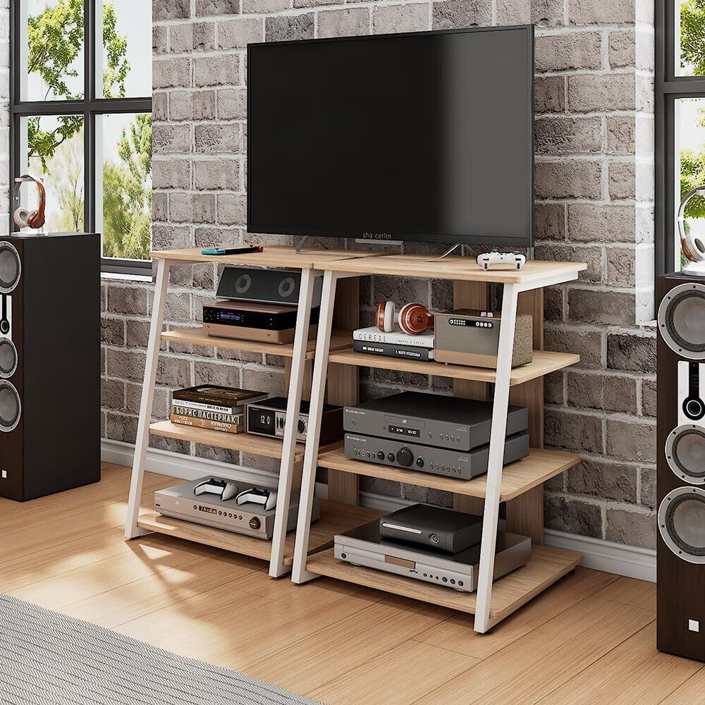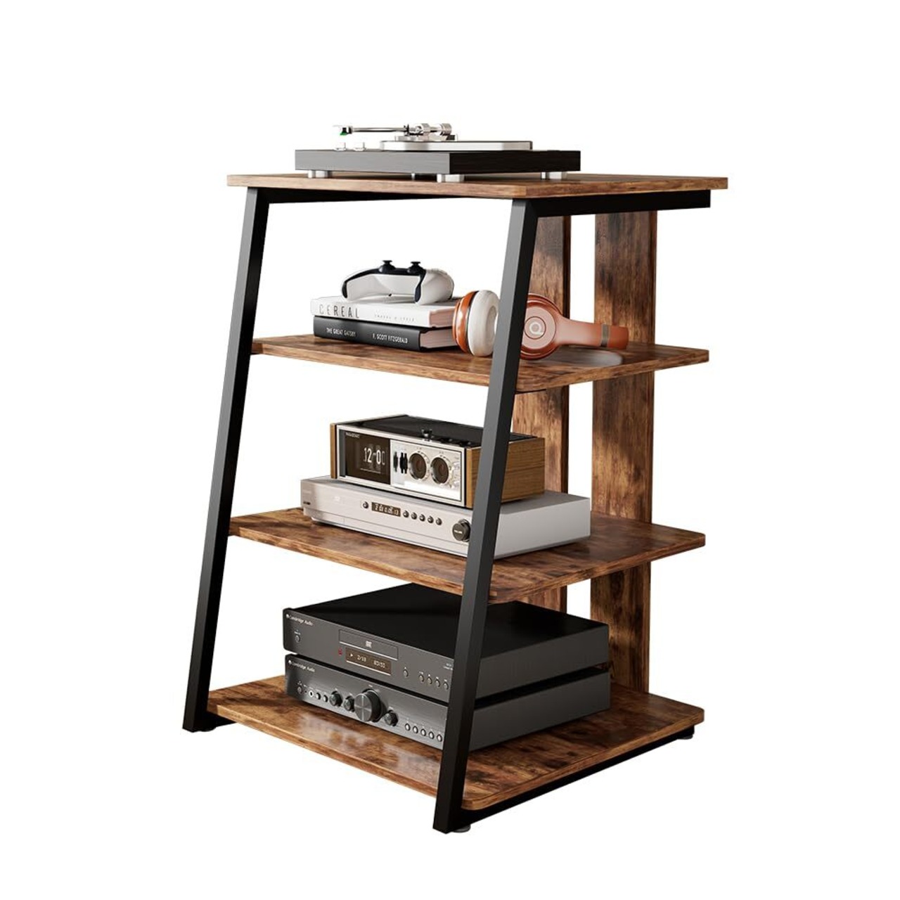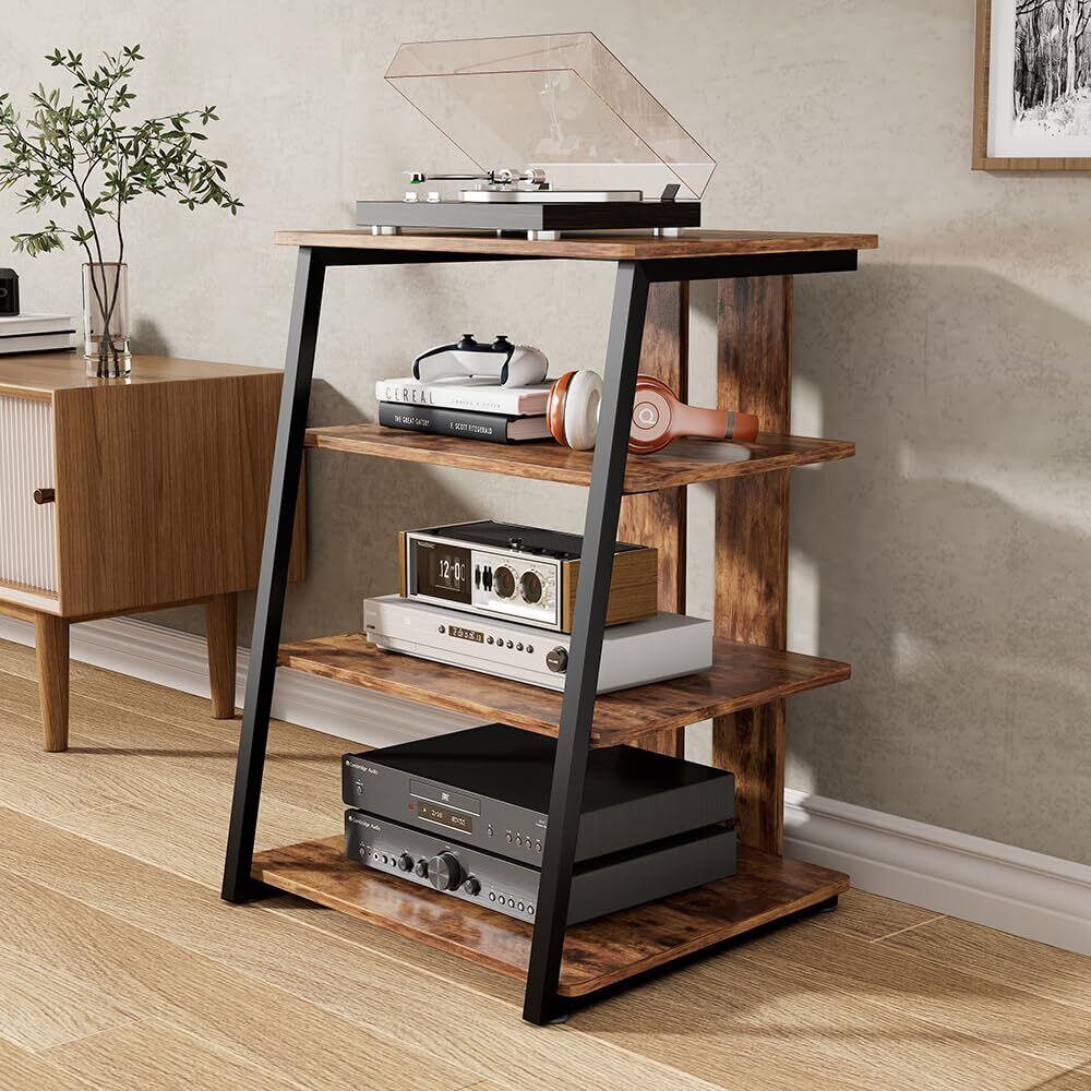 オーディオラック AV棚 インテリア 台形 木目調棚板 オープンシェルフ テレビ台 オーディオスピーカーアンプキャビネット CDアンプ機器ラック ホームストレージシェルフ 4段 多機能収納 TV台 スチール製フレーム 裏面配線 (ダークブラウン)