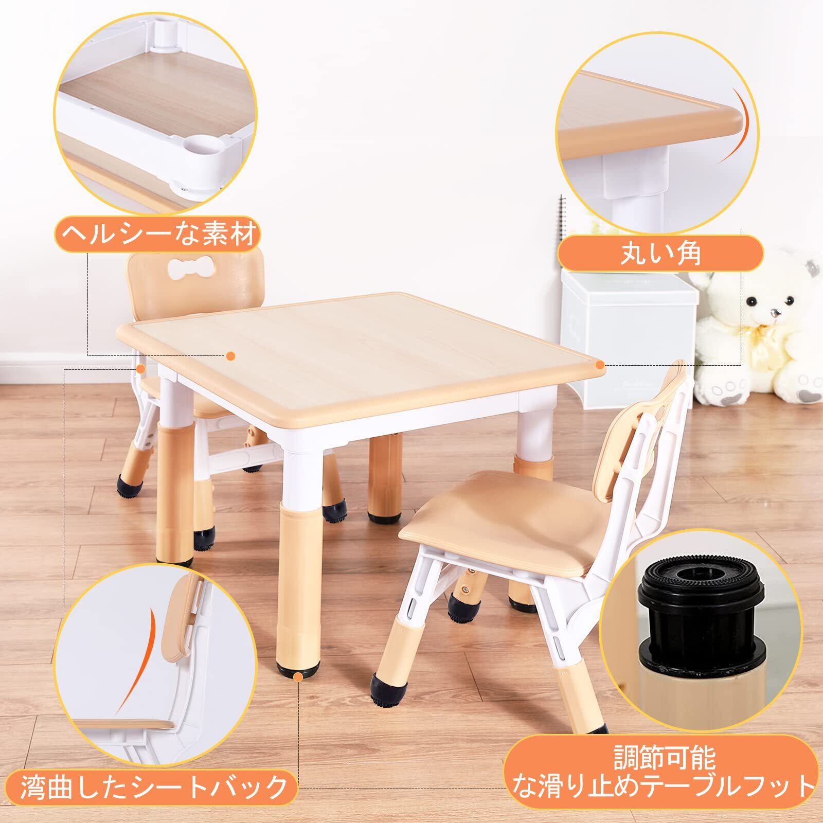 FUNLIO キッズテーブルと椅子2脚セット 高さ調節可能な子供用テーブルとチェアセット 3~8歳用 拭きやすい 学習/絵かき/ダイニング 教室/保育園/家庭用 CPC&CE承認済み (3点セット)