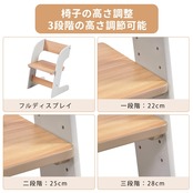 【3段階調整】成長に合わせて高さが変えられるデスクとチェアのセット。 デスク天板とチェア座板の高さはそれぞれ3段階調整できます。 また、チェアの背板の高さも成長に合わせて3段階調整可能。対象年齢は3-7歳。