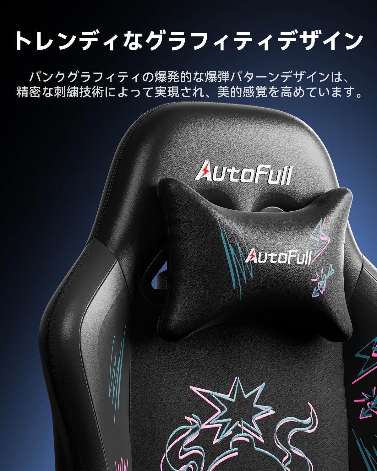 AutoFull(オートフル) C3 ゲーミングチェア 3D刺繍 デスクチェア 人間工学 3Dランバーサポート 椅子 座り心地最高 腰痛対策 昇降アームレスト チェア 人間工学フットレスト 在宅 リモート パソコンチェア PUレザー ブラック 黒 3年