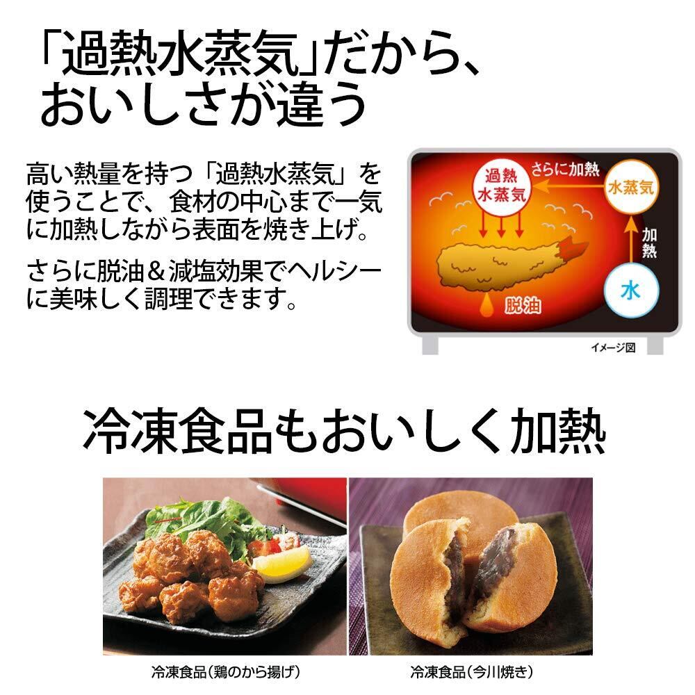 パンが焼きたてのようなおいしさ。トーストが絶品! モーニングセットを同時調理できる。お惣菜が作りたてのようなおいしさ。しかもヘルシー。ノンフライ調理で、うれしいカロリーダウン。●扉の内側にもガラスを装着し、パンくずや水滴などはサッと拭くだけで庫内のお手入れラクラク。シリコンコーティングトレイで、汚れがこびりつきにくい。冷凍食品も、過熱水蒸気のチカラで、おいしく加熱。グラタンなど、簡単な焼き調理にも使える。操作はカンタン3ステップ