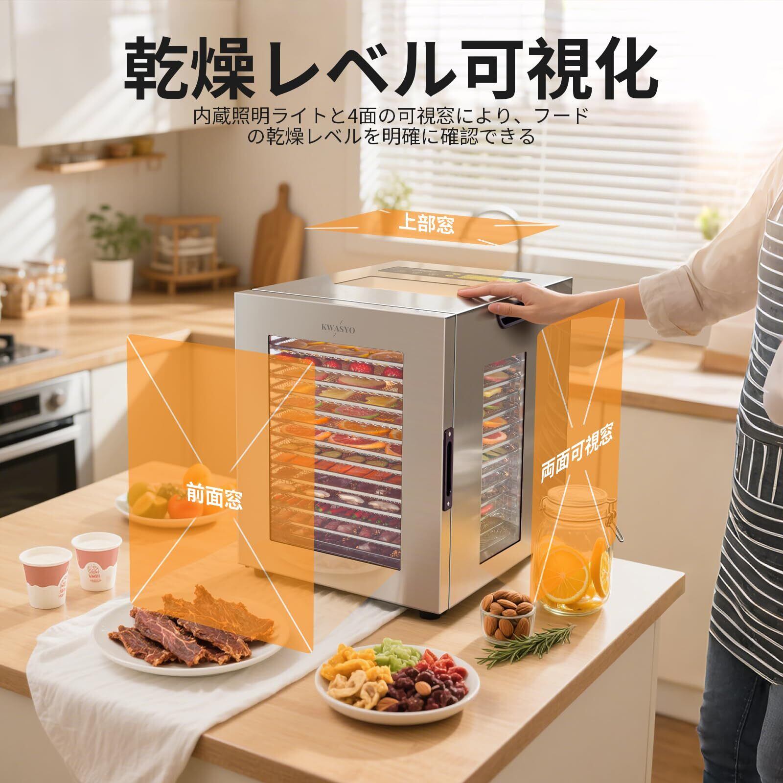 KWASYO【2025年モデル】15段フードドライヤー ステンレス鋼製食品乾燥機 可視窓 大容量 デュアルファン 1200W高効率 30-90℃温度調節 0-24Hタイマー設定 LEDディスプレイ オーバーヒート保護 自動電源オフ フルーツ 野菜 肉 ハーブ 干し芋 乾燥 発酵ドライフードメーカー 業務用 家庭用 レシピ本付き
