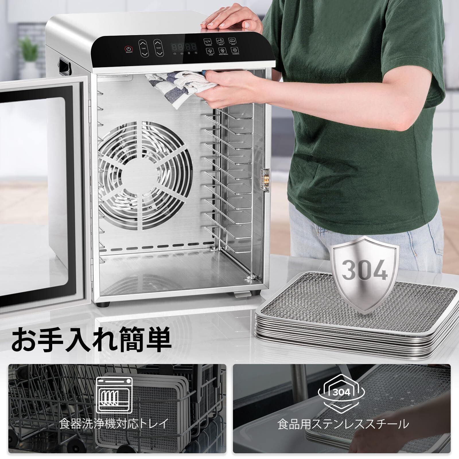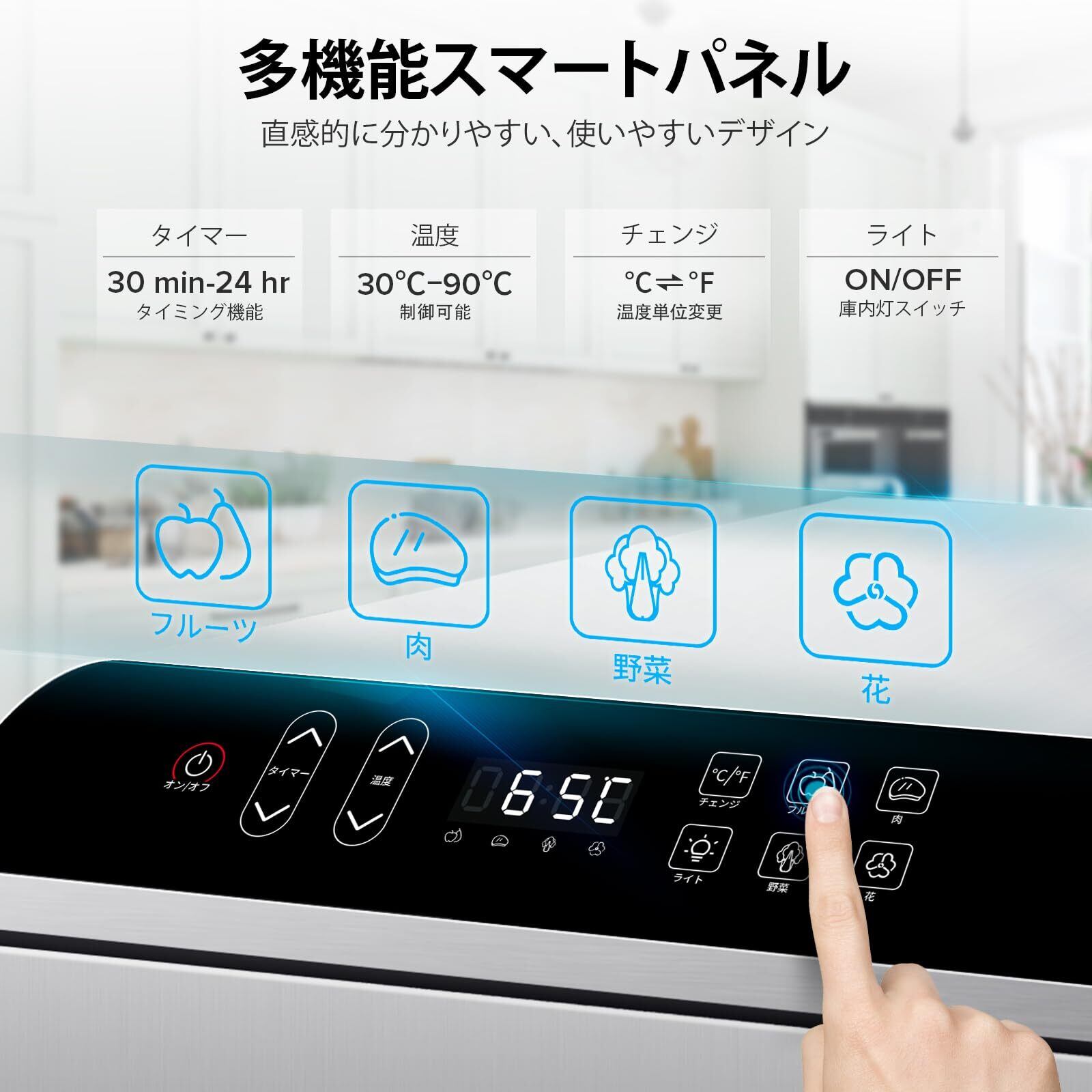 【操作簡単】スマートパネルにて食材によって異なる温度と時間を簡単に設定できます。食品乾燥機は30分ずつ24時間タイマーを調整できるので、タイマーをセットしておき放置でも楽です。 温度も30度から90度まで±5℃ずつ精確に制御できます。温度が低すぎて乾燥しない問題を解決し、温度が高すぎて栄養が失われる問題も回避することは可能です。野菜、果物、肉を乾燥させるための温度要件を満たすこともできます。