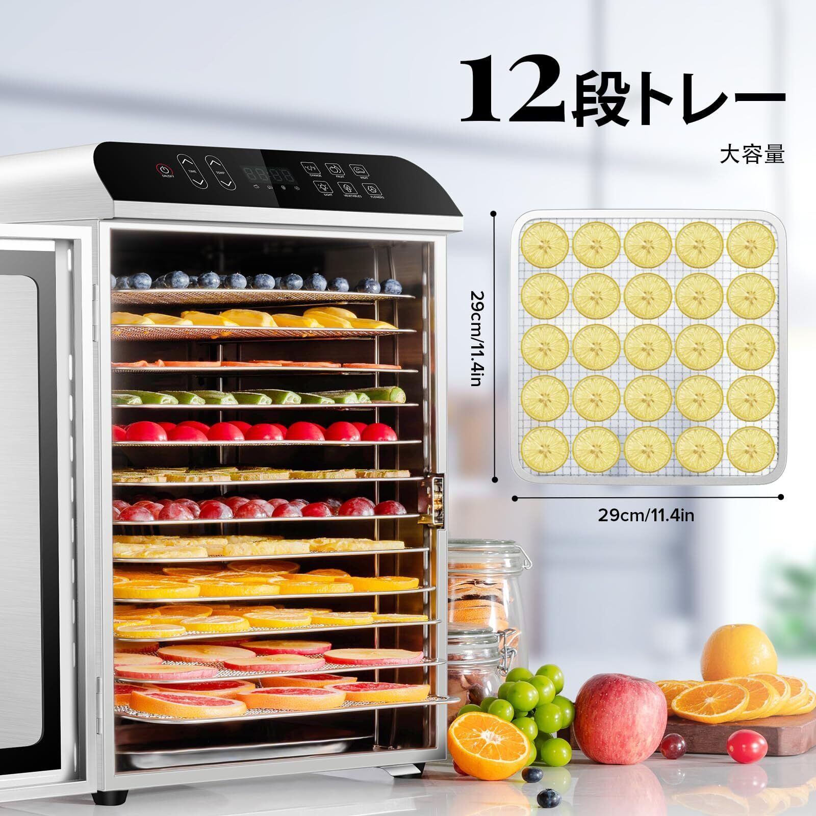 【数量限定】KWASYO 12段フードドライヤー 4種類自動メニュー付き ワンタッチ設定可能 大容量ドライフルーツメーカー ステンレス鋼ドライフードメーカー 800W食品乾燥機 高効率 果物 肉 野菜 花 乾燥機 業務用 家庭用 30-90℃ 0-24時間自由調節 レシピ本付き