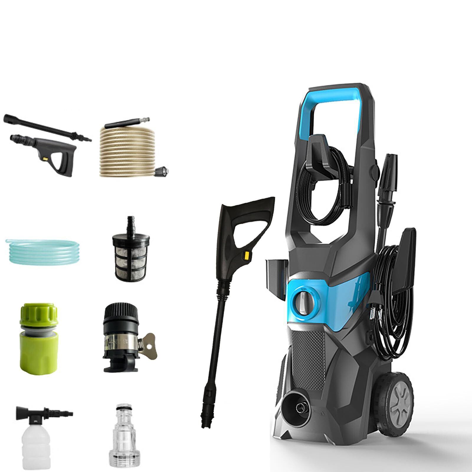 高圧洗浄機 1800W 17MPa 水道直結 自吸両用 高圧ホース16m 電源コード1.5m 二重絶縁 IPX5防水 家庭用 洗車 清掃 強力噴射 家庭用 静音 2点セット コンパクト 50Hz/60Hz ウォッシュブラシセット 洗車機 洗車用品 ベランダ 外壁 コケ 除去 業務用 PSE認証済み (ブルー)