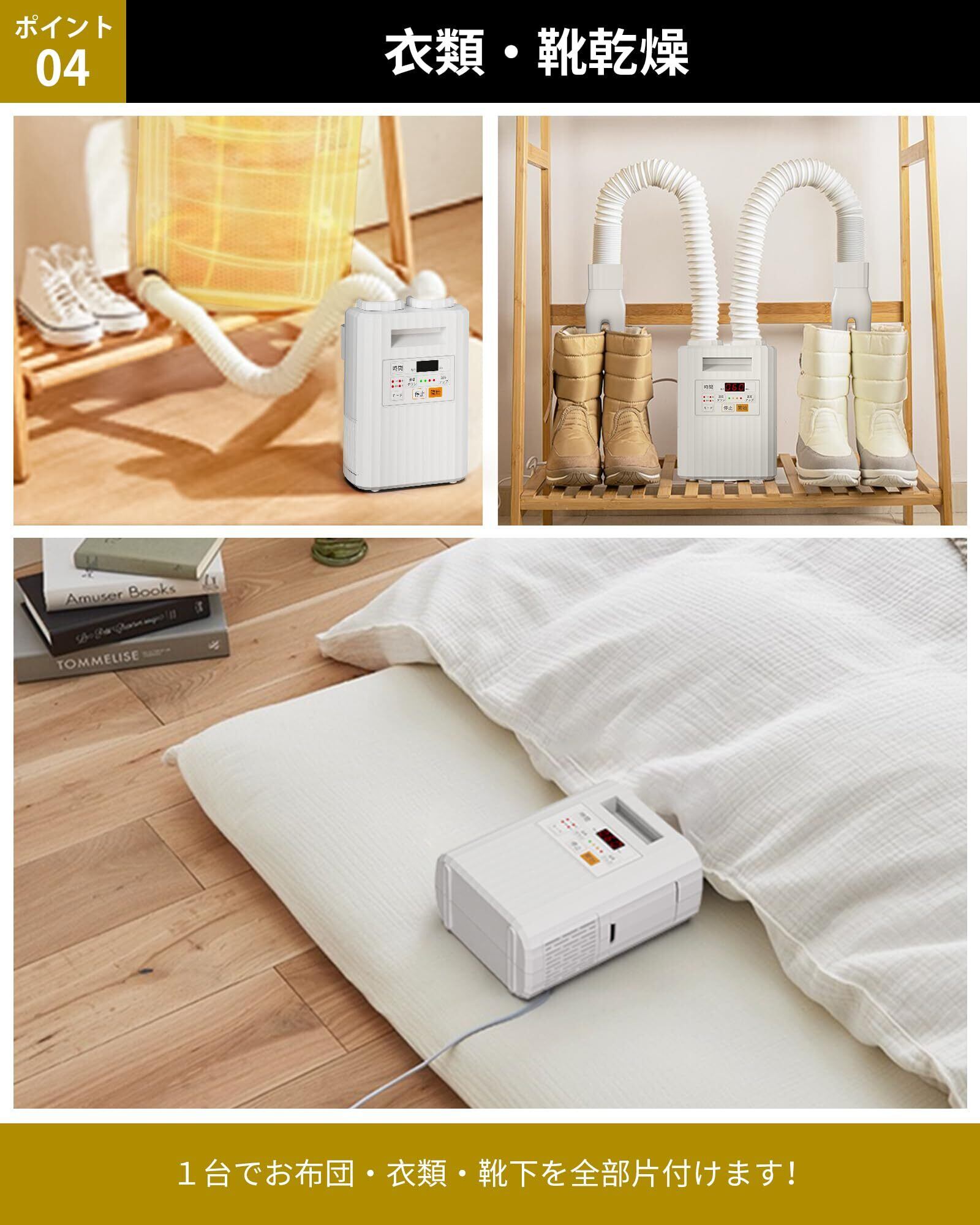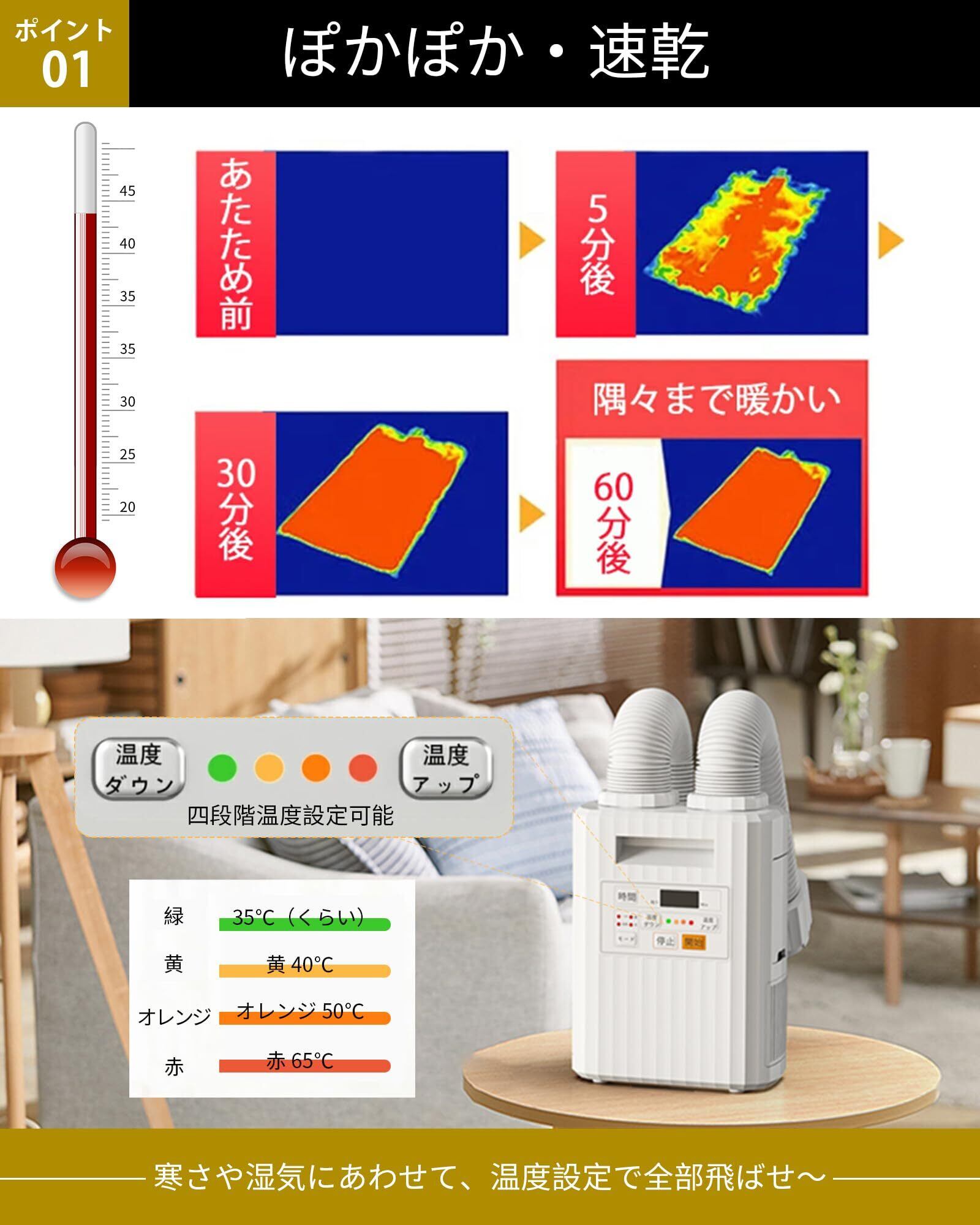 ふとん乾燥機 ダニ退治 速ぽかぽか ツイン立体ノズル 2組布団対応 布団干し 布団保護 靴乾燥 衣類乾燥袋付き 四段階温度調節 八段階タイムスケジュール可能 ふとんかんそうき ホワイト