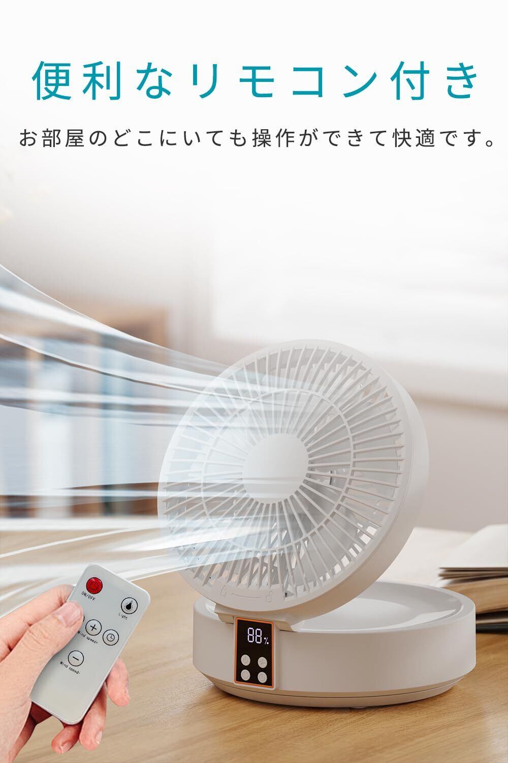 Ni Zmir サーキュレーター 【静音 リモコン付き 3/6/9時間タイマー 左右自動首振り Type-C充電式 折りたたみ式】 卓上扇風機 壁挂可能 8畳 空気循環 換気 3段階風量 LEDライト機能付き 5枚羽根 4000mAh大容量 軽量 上下手動調整 最大10時間連続使用 外せ洗える 滑り止めシリコンマット 省エネ 梅雨 除湿 日本語取扱説明書付き
