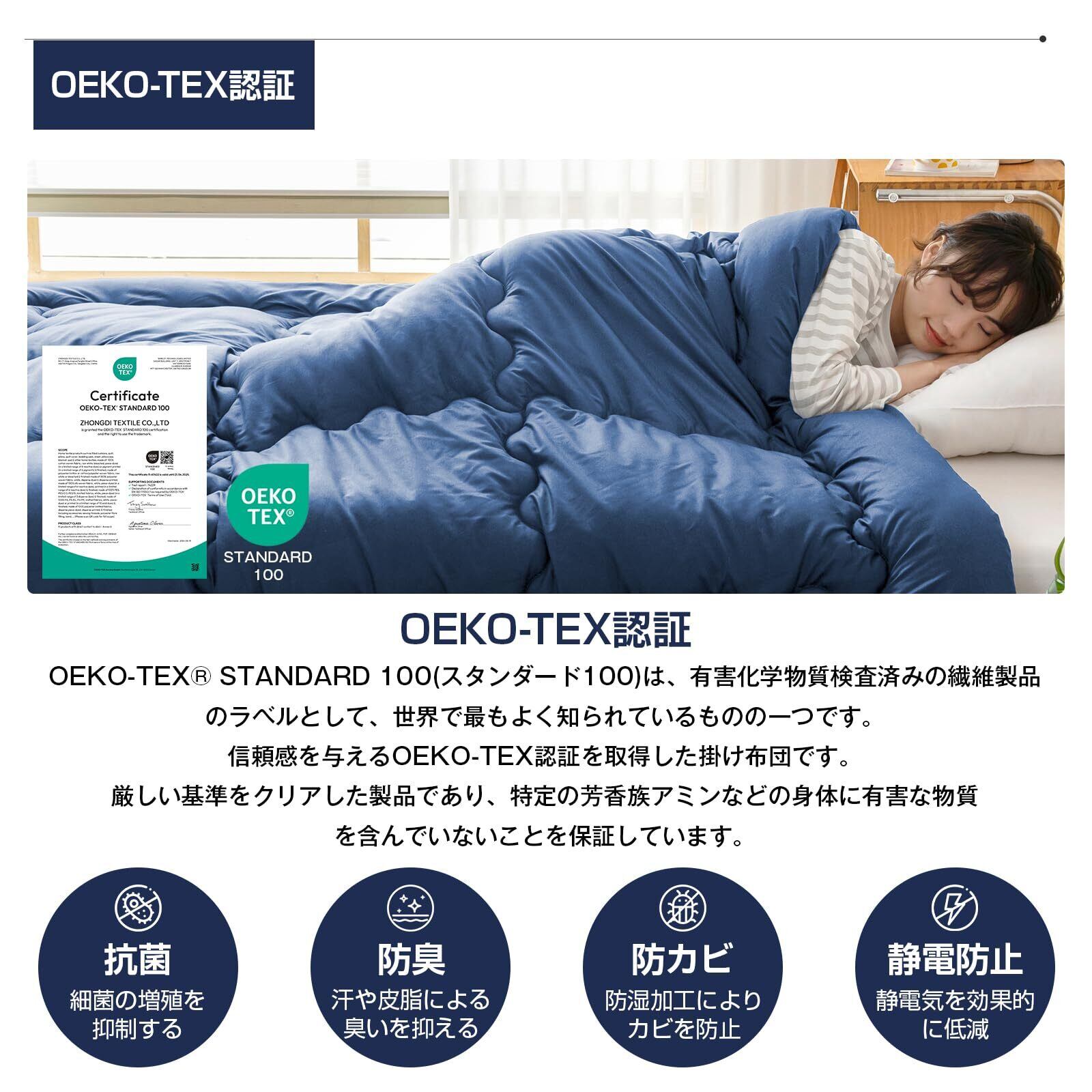【抗菌防臭ふとん·OEKO-TEX認証·安心掛布団】アメリカの大手化学企業デュポンが開発した細菌の発生を抑える抗菌剤SILVADURを使用。掛け布団の生地だけでなく中綿まで防ダニ・抗菌防臭加工を施し、いつでも清潔でいられます。確実な抗菌防臭・防ダニ効果はSEK認証も獲得し、清潔さは安心できます。通気性もアップし快適な寝心地を感じられます。信頼感を与えるOEKO-TEX認証を取得した掛ふとんです。厳しい基準をクリアした製品であり、特定の芳香族アミンなどの身体に有害な物質を含んでいないことをしています。