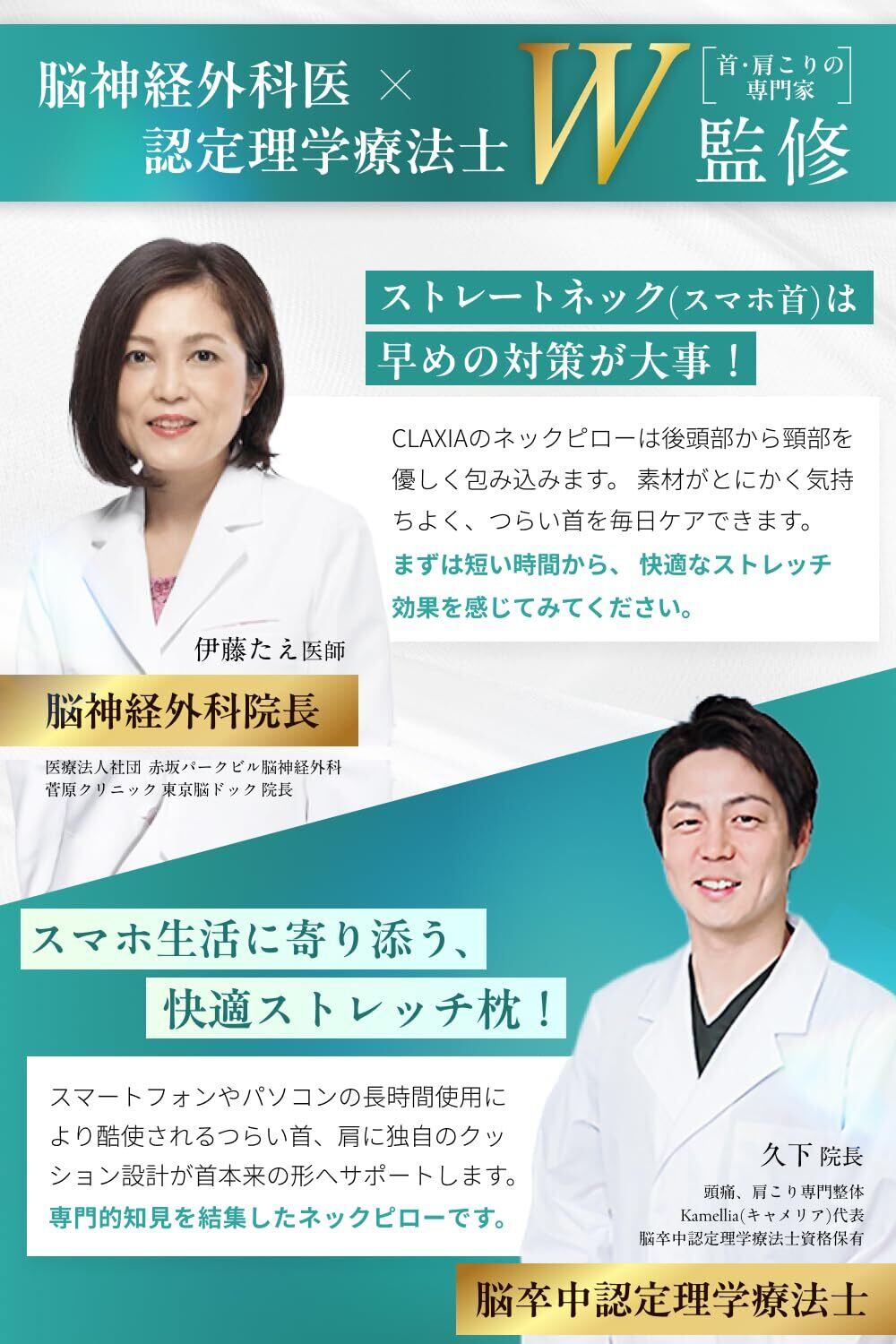 【専門家2名による監修】 脳神経外科院長と認定理学療法士の監修を受けたモデルで、日々酷使される首に快適なサポートを提供します。専門家の知識を活かし、首や肩に負担をかけずにストレッチが可能となる独自のカーブ設計により、快適な使用感を実現しました。日常的なケアの悩みを軽減するために開発された製品です。