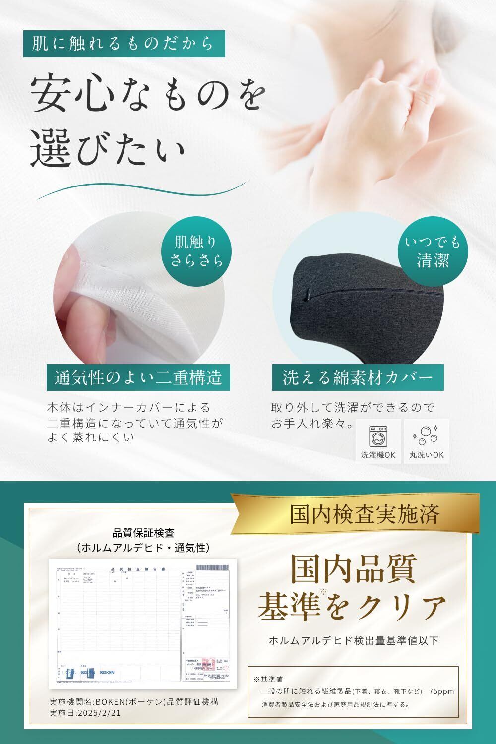 【日本国内検査機関による品質検査】 当製品はJIS L1041に基づき、遊離ホルムアルデヒドの検査を受けており、20mg/kg以下という基準値をクリアしています。この検査結果により、使用者はホルムアルデヒドによる健康リスクを心配する必要がなく、安心してお使いいただけます。肌に触れる製品だからこそ、品質には徹底したこだわりを持っており、安全性が確保された製品です。 【洗濯可能な本体カバー】は、JIS-L-1096 A法による通気性の検査を実施しており、38.2 m³/(m²・s)という結果を記録。 一般的な枕カバーの通気性が15~30 m³/(m²・s)であるのに対し、本製品は優れた通気性能を示しています。 この高い通気性により蒸れにくく、常に清潔で心地よい使用感を提供します。