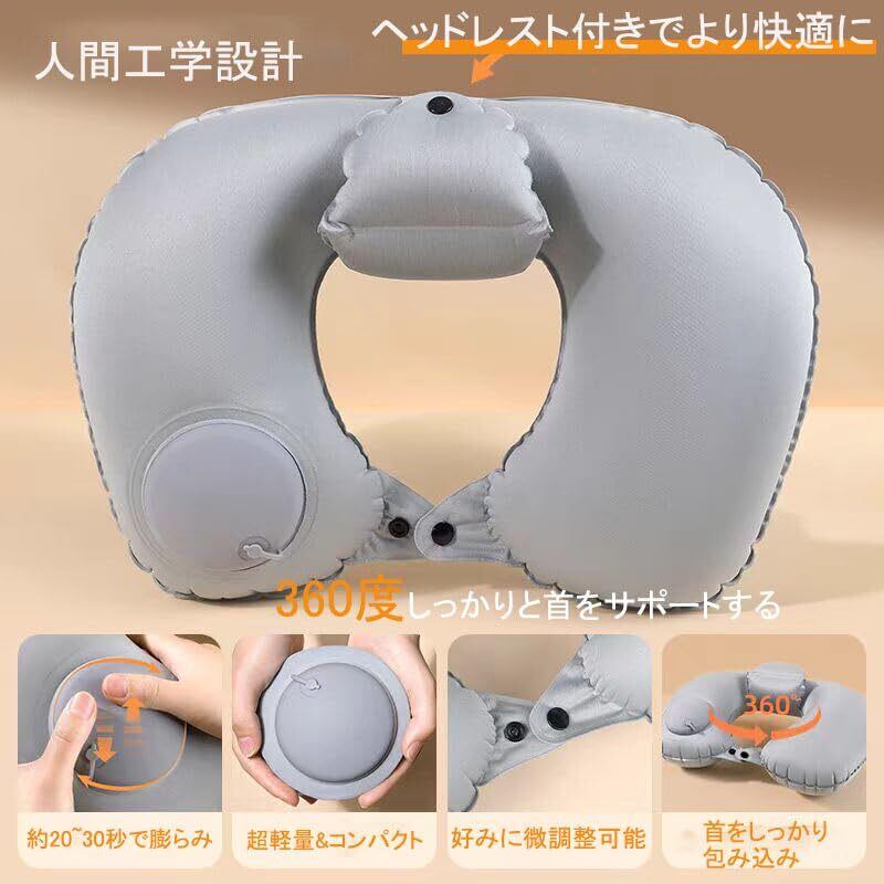 ネックピロー ポンプ式 U型 エアーピロー 首枕 ヘッドレスト付き エアピロー ポンプ 枕 携帯枕 超軽量 コンパクト 旅行 飛行機 バス 海外旅行 収納ポーチ付 飛行機 旅行用 電車 車 携帯用枕 まくら 安眠 快眠 トラベルグッズ ダークグレー