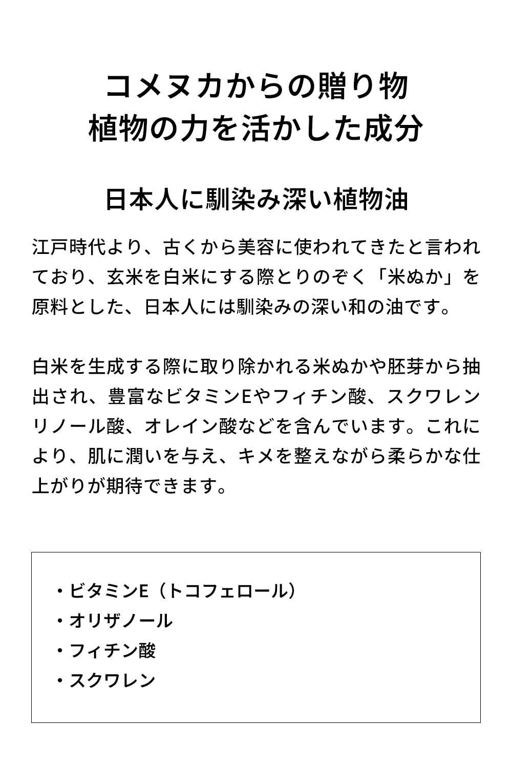 【 日本人に馴染み深い植物油 】江戸時代より、古くから美容に使われてきたと言われており、玄米を白米にする際とりのぞく「米ぬか」を原料とした、日本人には馴染みの深い和のライスブランオイルです。