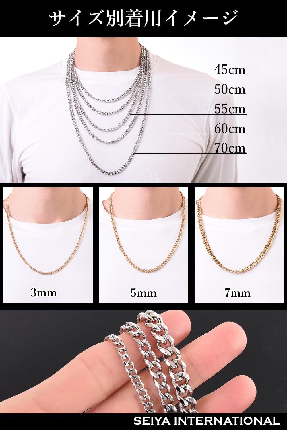 【選べるカラー・サイズ】 シルバー ゴールド ブラック 幅 3mm・5mm・7mm チェーンの長さ45cm・50cm・55cm・60cm・70cmのそれぞれ計45種類ご用意しております。細めのチェーンから太めのチェーンと長さを選べるため、きっとあなたのお気に入りが見つかります。