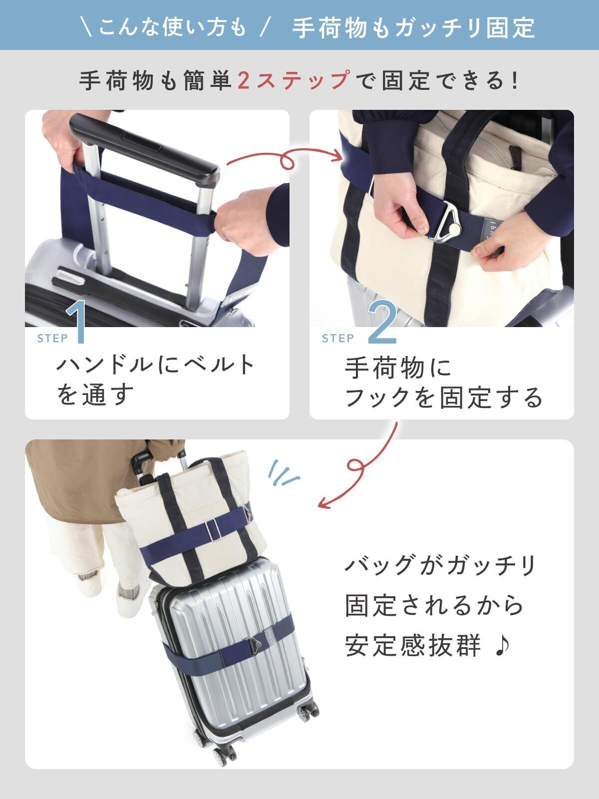 【荷物が固定できる】目印としての用途に加えて、荷物をスーツケースに固定することもできるから、片手が自由になります。