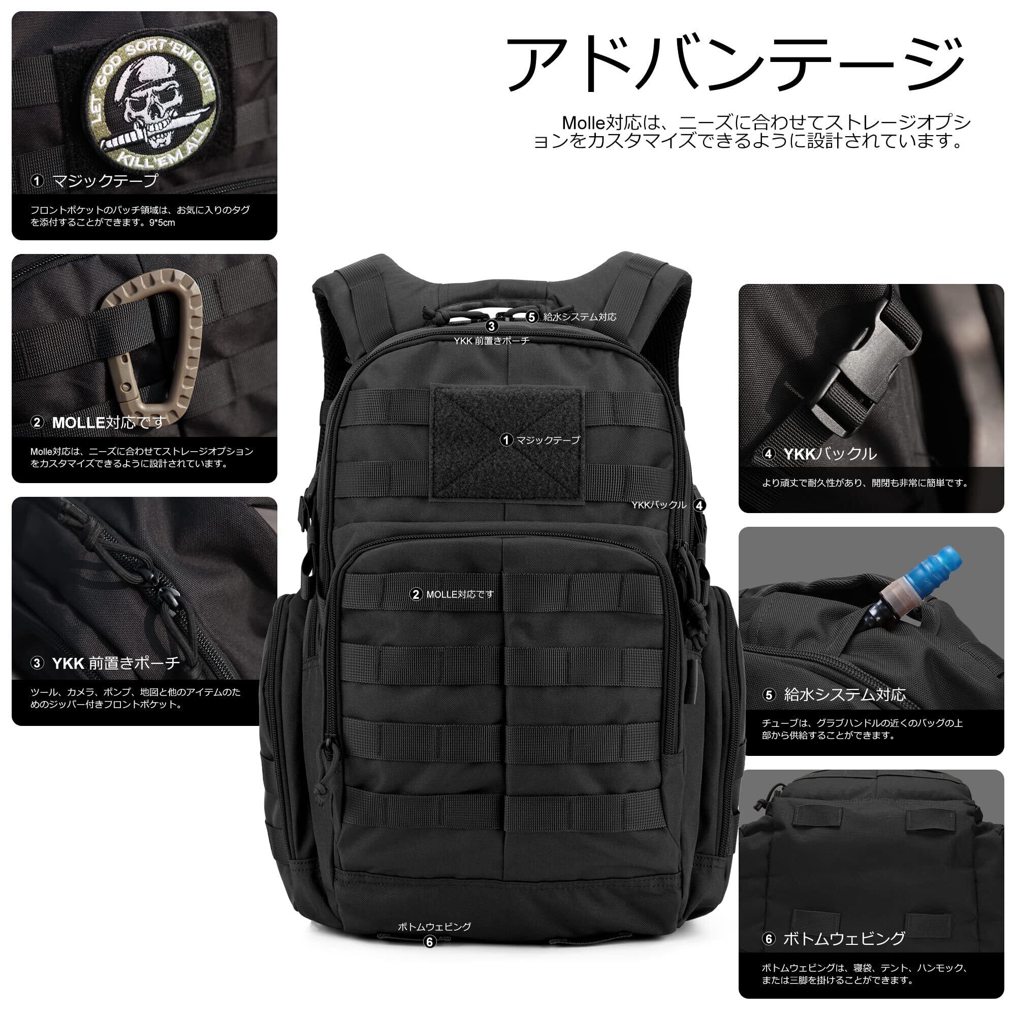 【MOLLE対応です】このリュックサックは、小さなアイテムに掛けたり、追加のポーチやギアを取り付けたりできます。 バックパックには、ベッドロール、テント、またはその他のものをストラップするための4つのmolleフックも下にあります。 サイドポーチはウォーターボトルにフィットします。