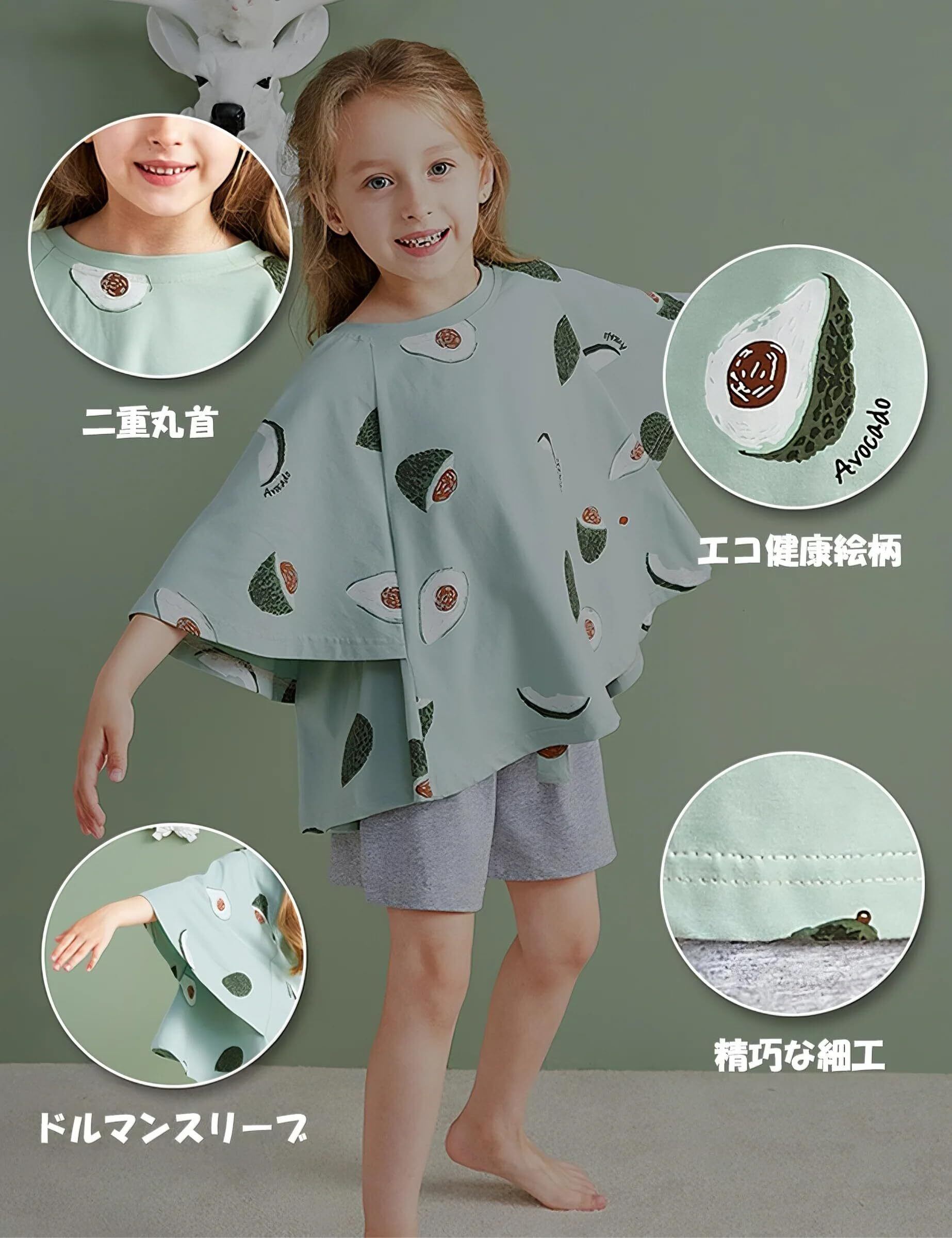 【おしゃれなルームウェア】おしゃれな蝶の袖のデザインで、お子様の可愛さを演出します。 鮮やかなカラーとキュートなアボカド柄で、お子様に愛されています。