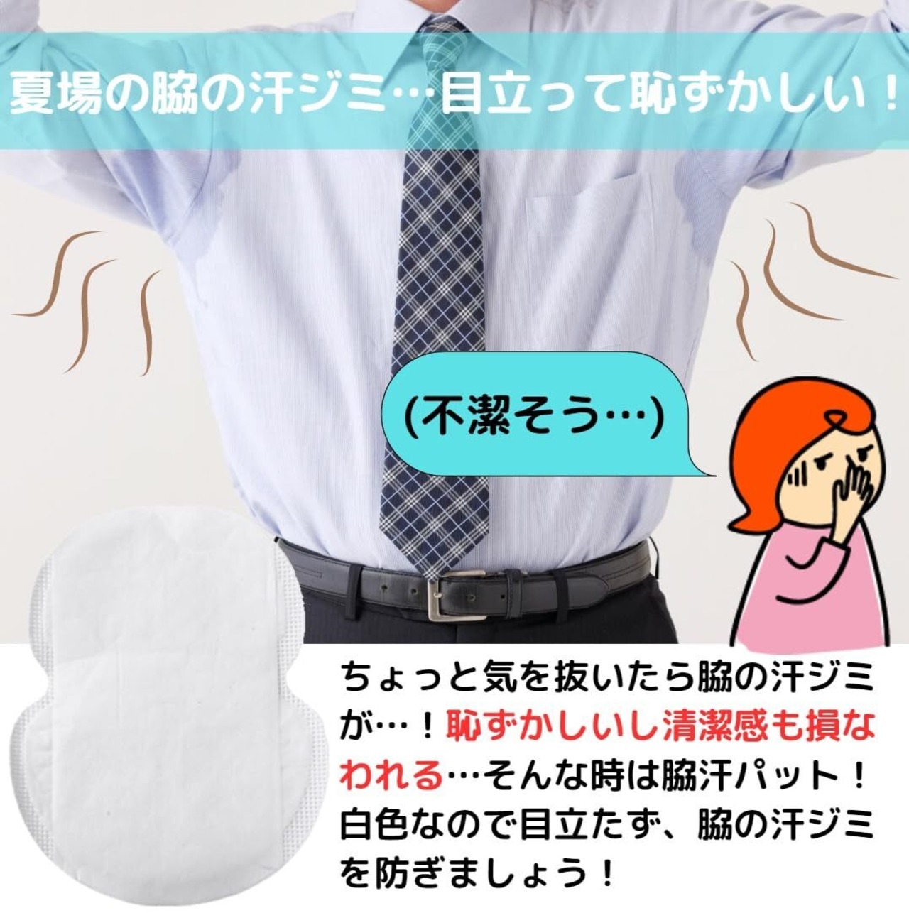 衣服の下に貼り付けることで脇汗を吸収し、脇の汗ジミを防ぎます。 夏場のエチケットにお困りの方におススメの徳用50セット!(100枚入り)