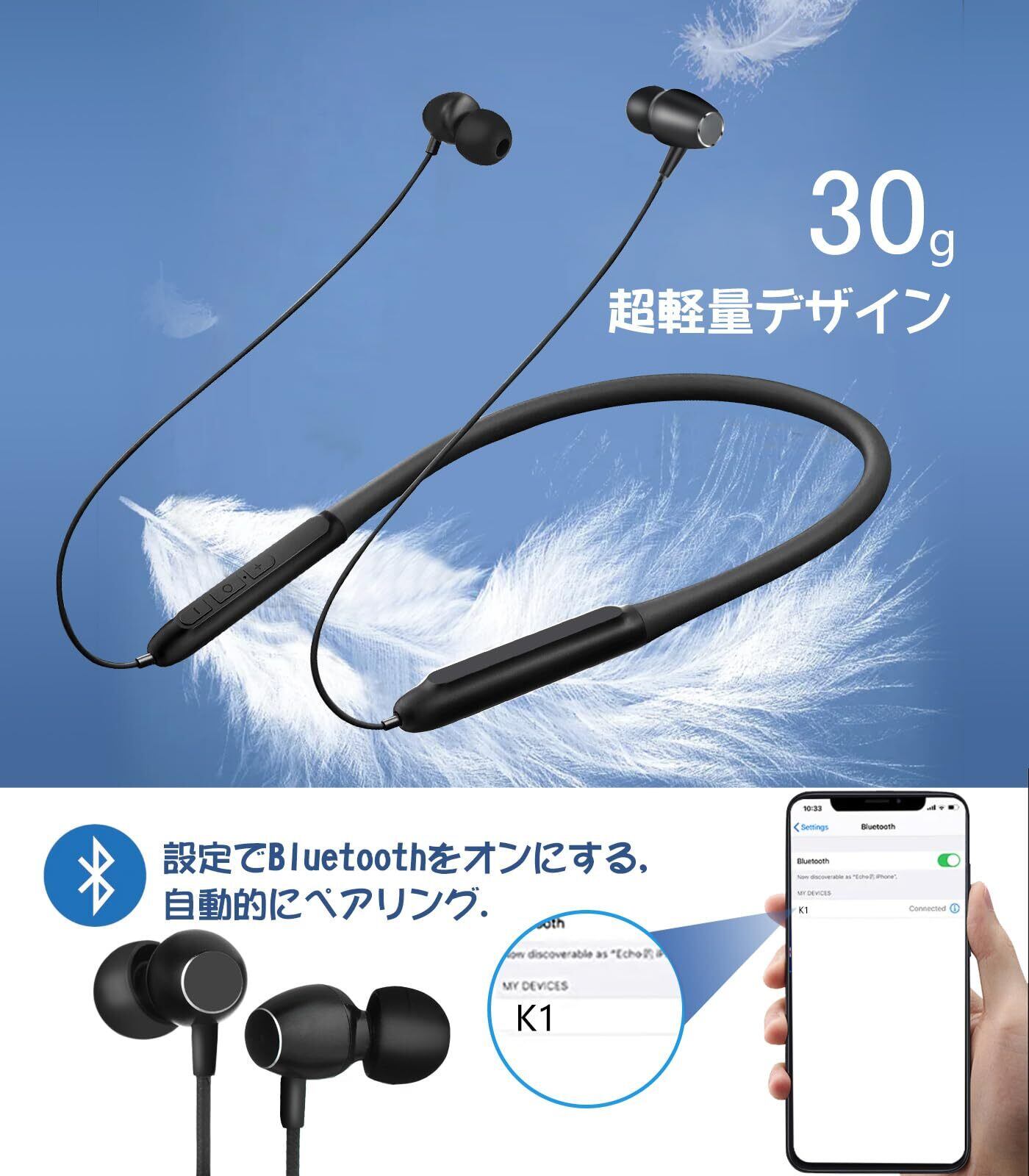 【軽量設計&IPX7防水】ネックバンド型 イヤホンはわずか30gの重さで、耳に圧力を感じることなく長時間装着しても疲れを感じません。またIPX7防水性能を備えて、汗や水しぶきに強い、突然の雨や、激しい運動の汗で濡れてもBluetooth イヤホンを安心して使えます。ジョギング、ランニング、ヨガ、スポーツ、ジム、サイクリングなどに適用します。