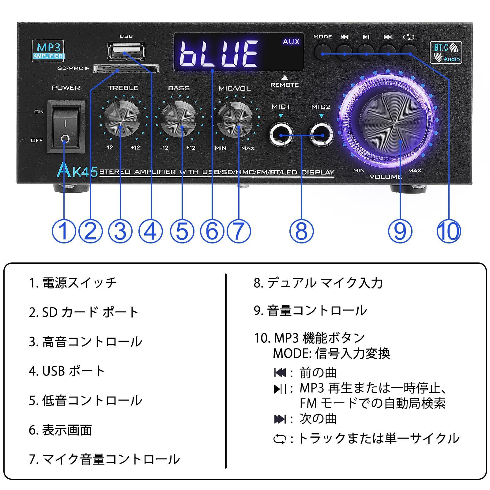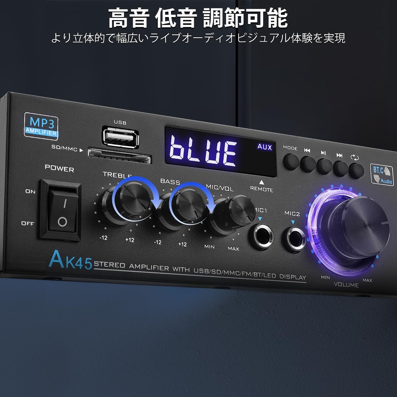 Bluetooth アンプ 5.0 HiFi ステレオ パワーアンプ レシーバー 2.0 チャンネル 2X40W ミニ アンプ 小型 ホーム オーディオ アンプ 低音/高音コントロール FM/USB/SD/MIC 入力 スピーカー用