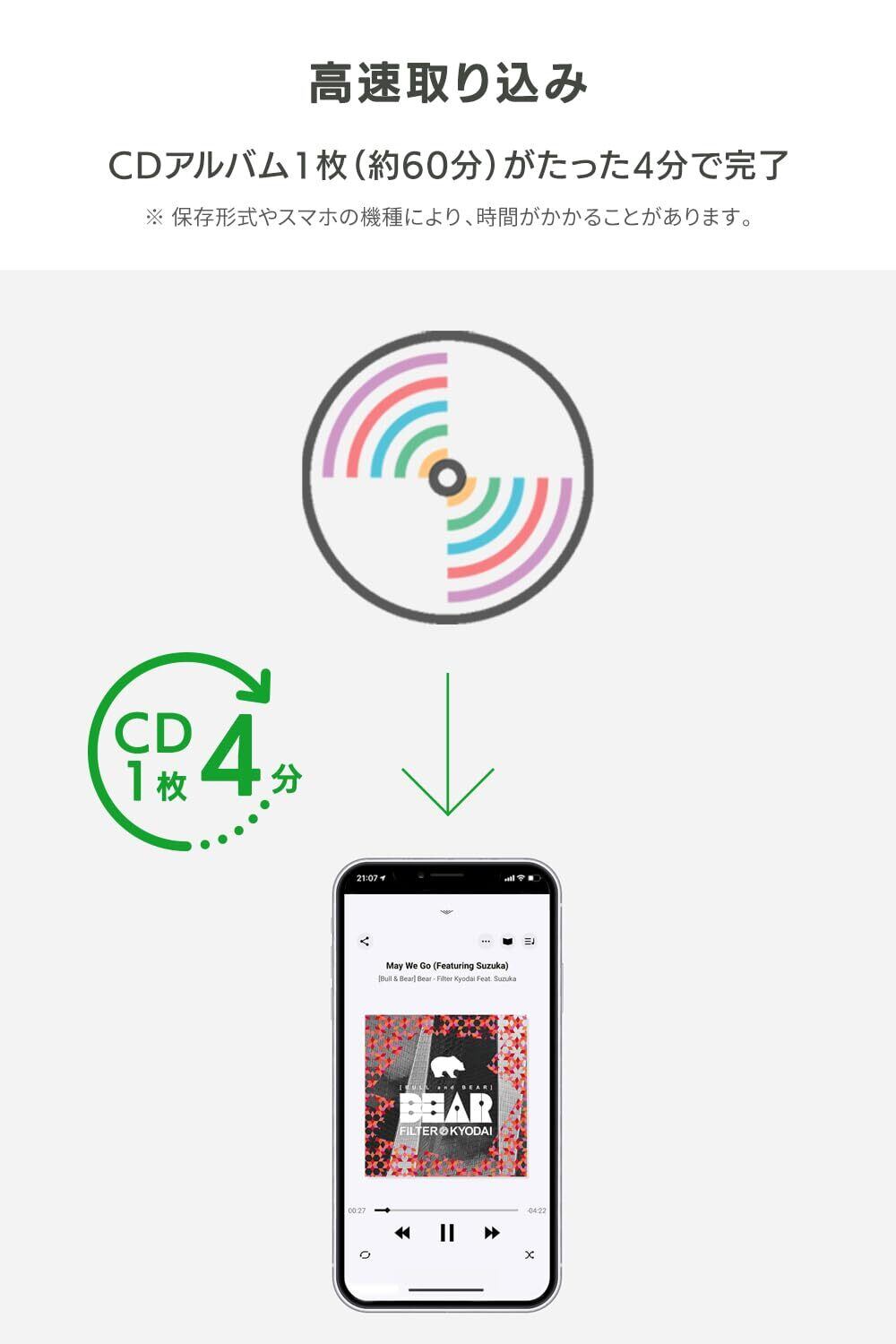 【パソコンなしでCDをスマホに入れて聴くCDレコーダー】「CDレコSE」は、お気に入りの音楽CDをスマホに入れて聴けるスマホ用CDレコーダーです。CDレコSEは、スマホとケーブルで接続します。専用のアプリ「CDレコミュージック」をインストールし、カンタンな操作でCDを取り込めます。
