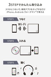 【パソコンなしでCDをスマホに入れて聴くCDレコーダー】「CD-5WDW」は、お気に入りの音楽CDをスマホに入れて聴けるスマホ用CDレコーダーです。CD-5WDWは、スマホとワイヤレスで接続します。専用のアプリ「CDレコミュージック」をインストールし、カンタンな操作でCDを取り込めます。