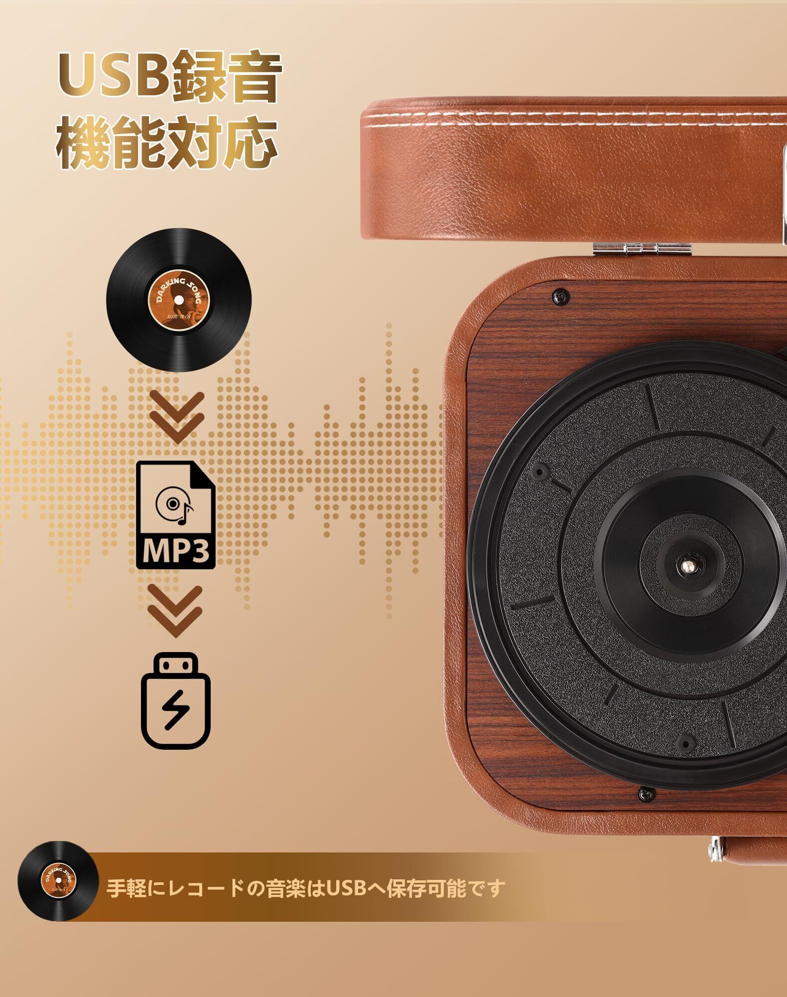 【特価セール】VOKSUN レコードプレーヤー Bluetooth送信と受信 USB録音可能 外部スピーカーに繋ぎ 33/45/78回転と7/10/12インチレコード対応 スピーカー内蔵 レトロ 日本語説明書 ブラウン 2年 S300