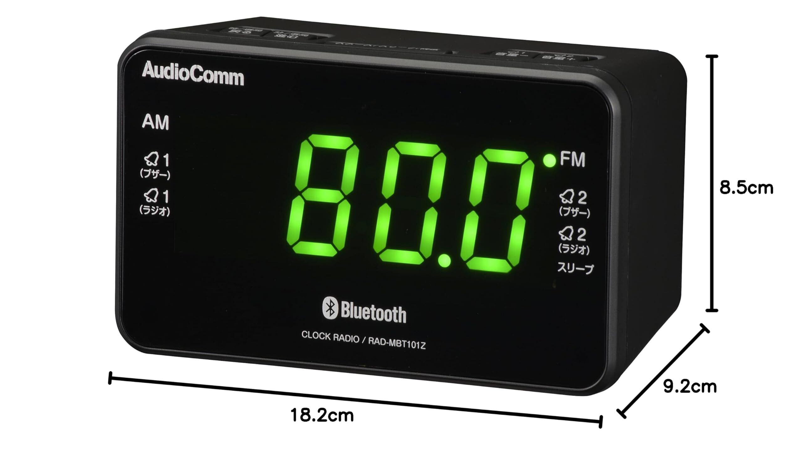 【 特 長 】● Bluetoothスピーカー内蔵でスマホの音楽もワイヤレスで聴けます● Bluetooth Ver.5.0● 見やすいLED表示● LED輝度4段切替● AM/FM各20局プリセット登録● アラーム2系統● スヌーズ&スリープ機能付き● AUX外部音声入力端子● ワイドFM対応【 仕 様 】■ 電源:AC100V 50/60Hz、時計バックアップ用電源…DC3V 単4形乾電池×2本(別売)■ 定格消費電力:4.4W■ 実用最大出力:0.8W■ スピーカー:口径約36mm(8Ω)×1■ 再生周波数帯域:60~18000Hz■ 受信周波数:AM…522~1710kHz受信(9kHzステップ)、FM…76~108MHz受信(0.1MHzステップ)■ 選局プリセット:AM/FM各20局(自動選局・自動登録可能)■ 接続端子:外部音声入力端子(φ3.5mmステレオミニジャック)■ 外形寸法:幅135×高さ83×奥行71mm(突起物含まず)■ 質量:約385g(電源コード含む、時計バックアップ用乾電池含まず)■ 時計精度:月差約±45秒■ 付属品:書付取扱説明書 Bluetooth部■ 通信方式:Bluetooth標準規格 Ver.5.0■ 対応プロファイル:A2DP、AVRCP■ 出力:Class2■ 最大通信距離:見通し 約10m■ 使用周波数帯域:2.402~2.480GHz■ 変調方式:GFSK■ 対応コーデック:SBC■ 伝送帯域(A2DP):20-20000Hz(44.1kHzサンプリング時)≪ご注意≫※ 本機は通話機能がありません。※ 本機はすべてのBluetooth対応機器との接続動作をするものではありません。※ Bluetooth機器側が同じプロファイルに対応していても、本機の性能・機能が制限される場合があります。※ 本機は日本国内専用です。