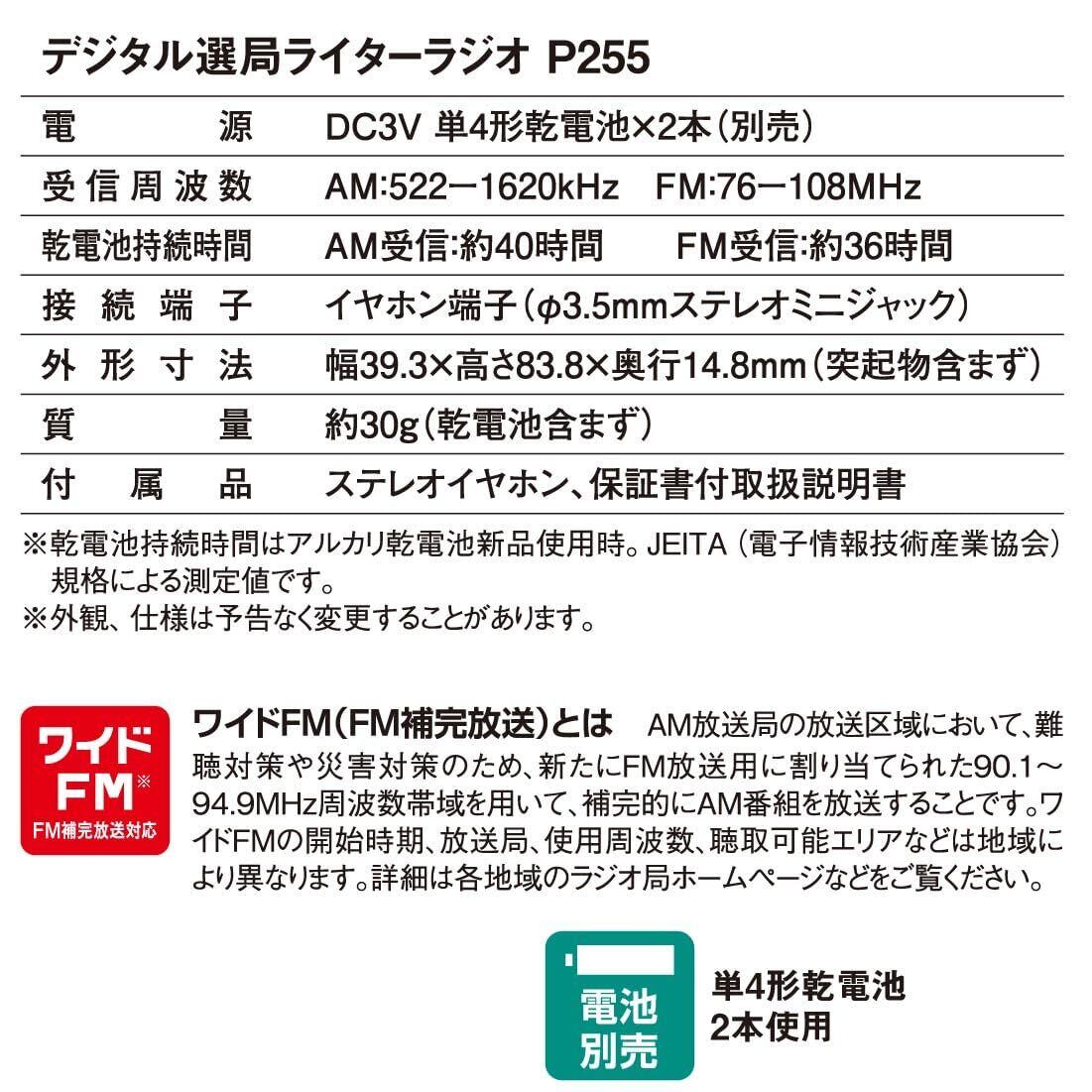 【 仕 様 】 ◆電源:DC3V 単4形乾電池×2本(別売) ◆受信周波数:AM…522~1620kHz、FM…76~108MHz ◆乾電池持続時間:AM受信…約40時間、FM受信…約36時間 ◆接続端子:イヤホン端子(φ3.5mmステレオミニジャック) ◆外形寸法:幅39.3×高さ83.8×奥行14.8mm(突起物含まず) ◆質量:約30g(乾電池含まず) ◆付属品:ステレオイヤホン、書付取扱説明書≪ご注意≫※ 本機はスピーカーのないイヤホン専用ラジオです。