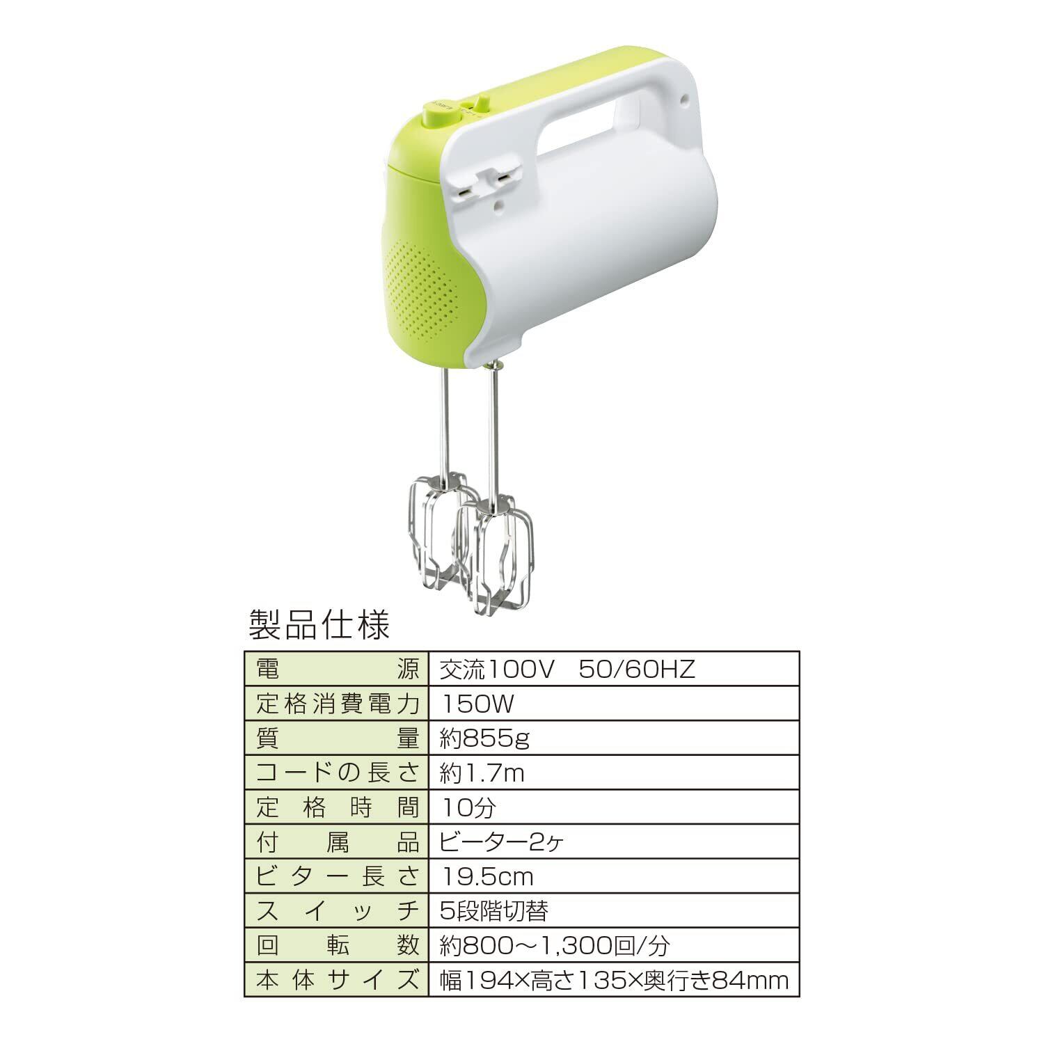 素材・材質:本体=ABS樹脂(耐熱温度80度)、ビーター部=ステンレススチール