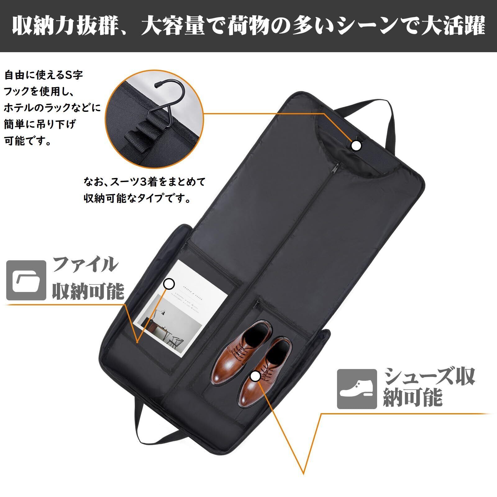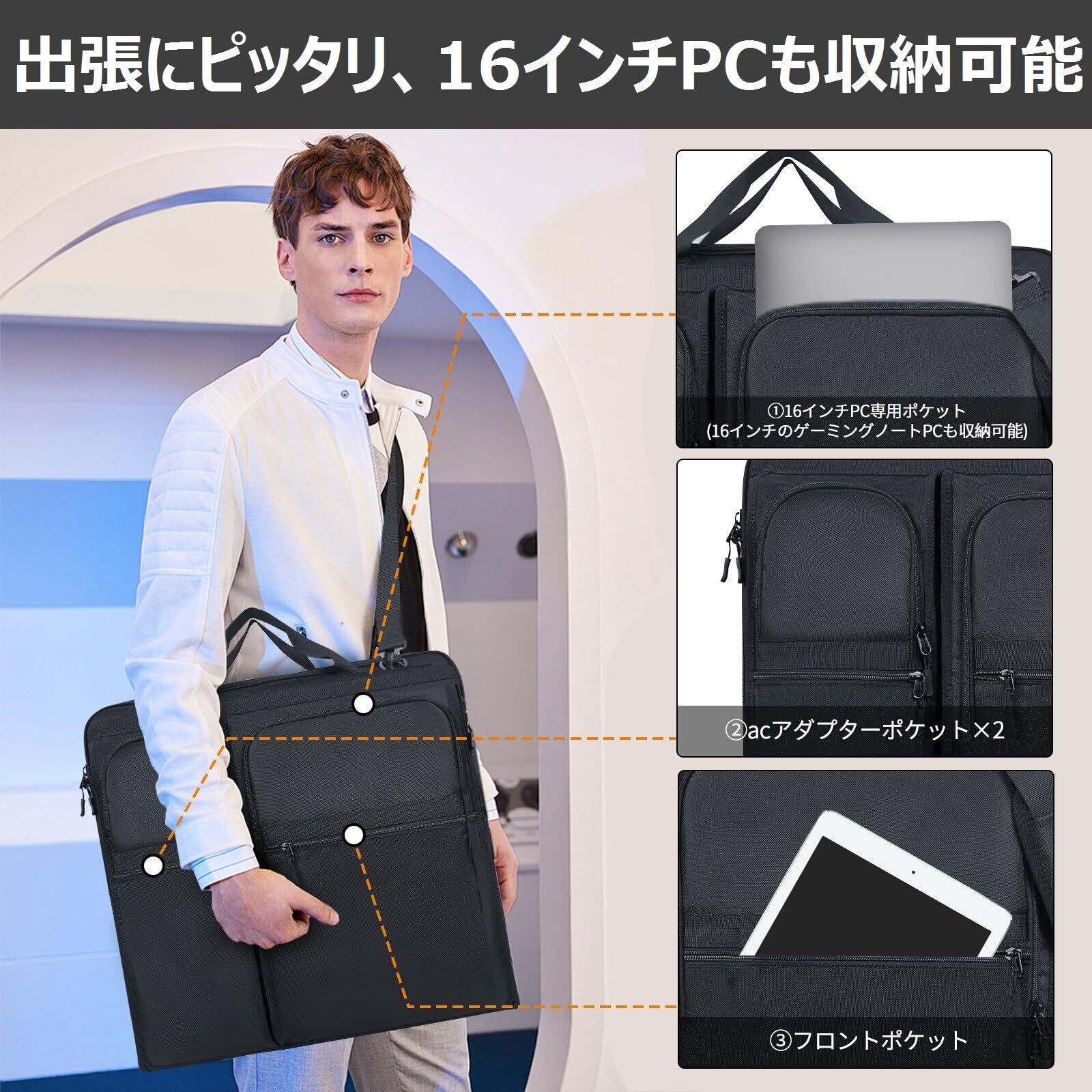 【16インチPC、スーツ3着をまとめて収納】①フロントポケットには、16インチ(16インチのゲーミングノートPCも収納可能)までのラップトップを収納できる独立したパッド入りラップトップコンパートメントが付いています。出張や旅行などの場合に最適です。②ビジネスマンであればキレイなスーツを着るのが常識。只、簡易なガーメントバッグだと持ち運びの際にシワが付いてしまうことも。この悩みを解決するのがこのガーメントバッグ。持ち運ぶ際にスーツがズレてシワにならないよう考えられた設計。それに、アップグレードしたデザインはスーツ3着をまとめて収納可能、スーツやドレスなどを収納できる最大の収納容量を提供します。