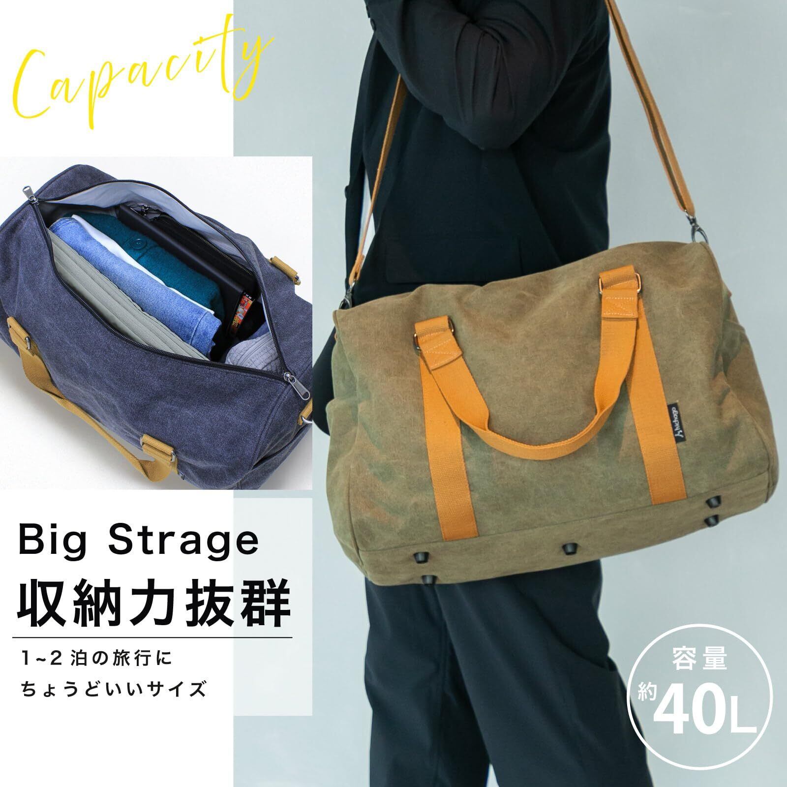 【大容量で収納力抜群】約40Lの大容量ボストンバッグは、1泊2日〜2泊3日の旅行や出張に最適。衣類やシューズ、ポーチ、ガジェット類までしっかり収納できるサイズ感で、ジム通いやキャンプ、帰省など多用途に活躍します。大きめながらも扱いやすく、軽量で持ち運びも快適。シンプルなデザインで男女問わず使いやすく、機内持ち込みにも対応。荷物が多い方に嬉しい、大容量でおしゃれなボストンバッグです。