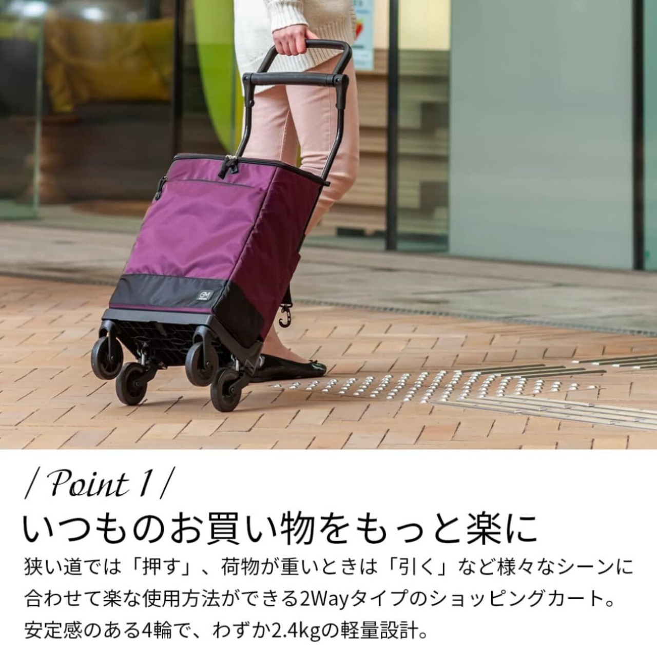 【いつものお買い物をもっと楽に】狭い道では「押す」、荷物が重いときは「引く」など路面の状況や、店内、公共交通機関など、様々なシーンに合わせて自分に合った楽な使用方法ができる2Wayタイプのショッピングカート。安定感のある4輪で、わずか2.4kgの軽量設計。「押す」「引く」使用時にハンドルを折り畳むことで2Wayが早変わり。自然に手を下ろした位置にハンドルが来るので、いつでも楽な姿勢でご使用いただけます。