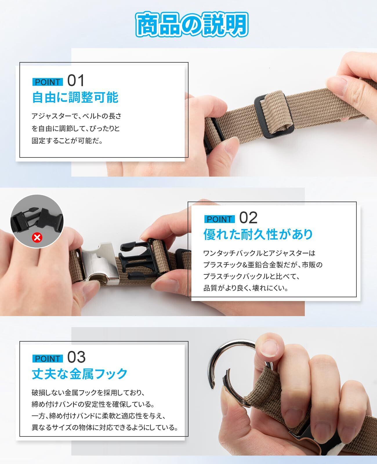 【商品仕様】荷物ストラップは1本だ。調整範囲:最大約24cm、最小約13cmまで調整可能。幅:約2.5cm。重さ:約32g。材質:プラスチック、亜鉛合金。カラー:ブラック、シルバーグレー、カーキ、ライトブルー、レッド、オレンジ。