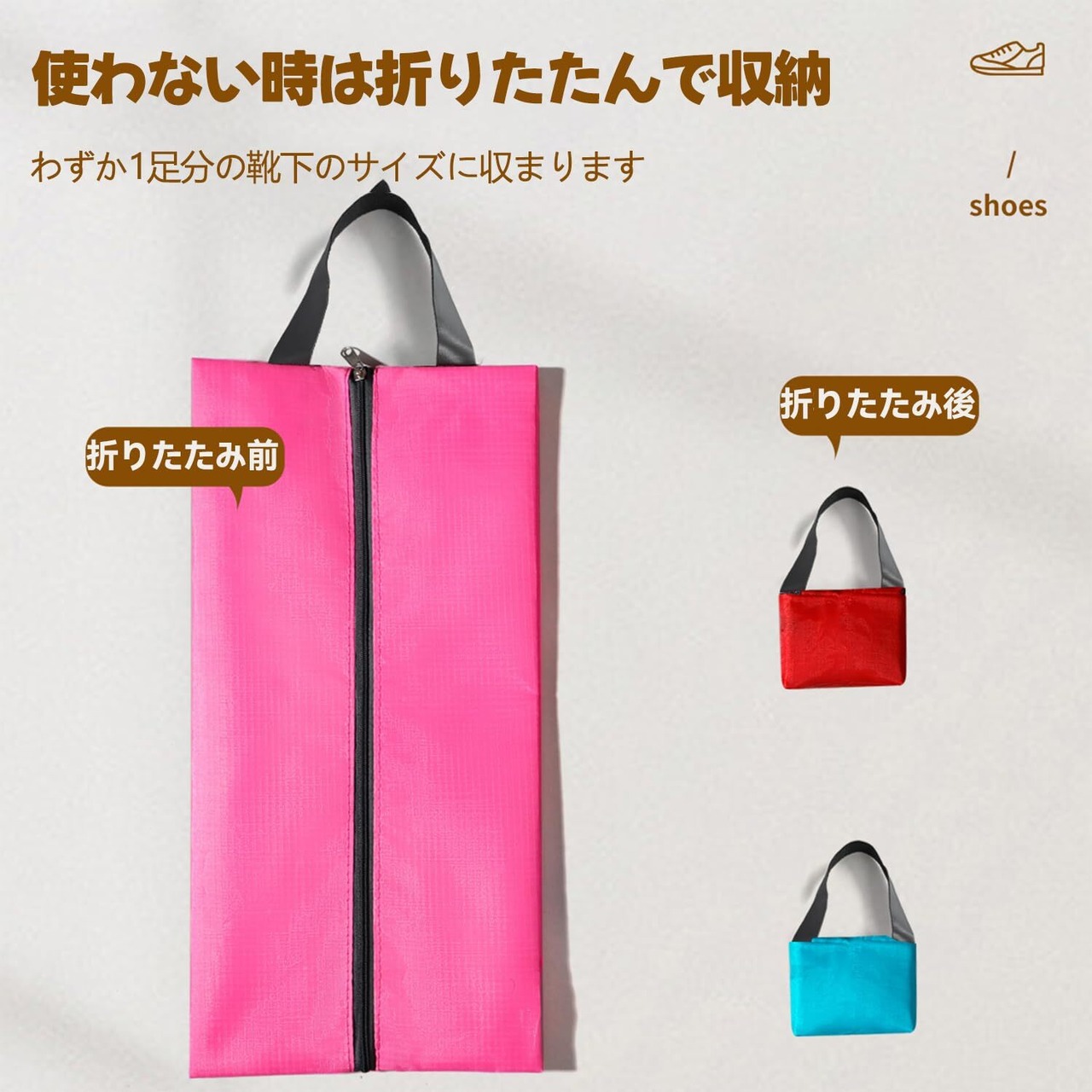 【多機能&大容量設計】 このシューズバッグは、スニーカーやビジネスシューズだけでなく、ジムシューズやサンダルなどさまざまな靴をスッキリ収納できる大容量設計です。さらに、靴下やその他の小物を一緒に収納できるスペースもあり、旅行や出張時にも非常に便利で、スマートに荷物を整理できます。
