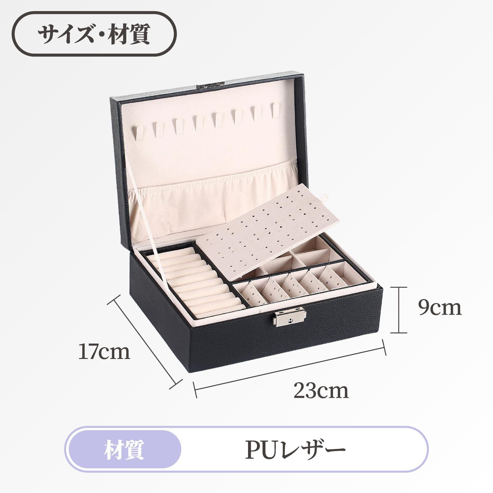 内部にはネックレスや指輪、ピアスなどを分類して収納できる仕切りやフックが付いており、ジュエリーの絡まりや傷つきを防ぎます。