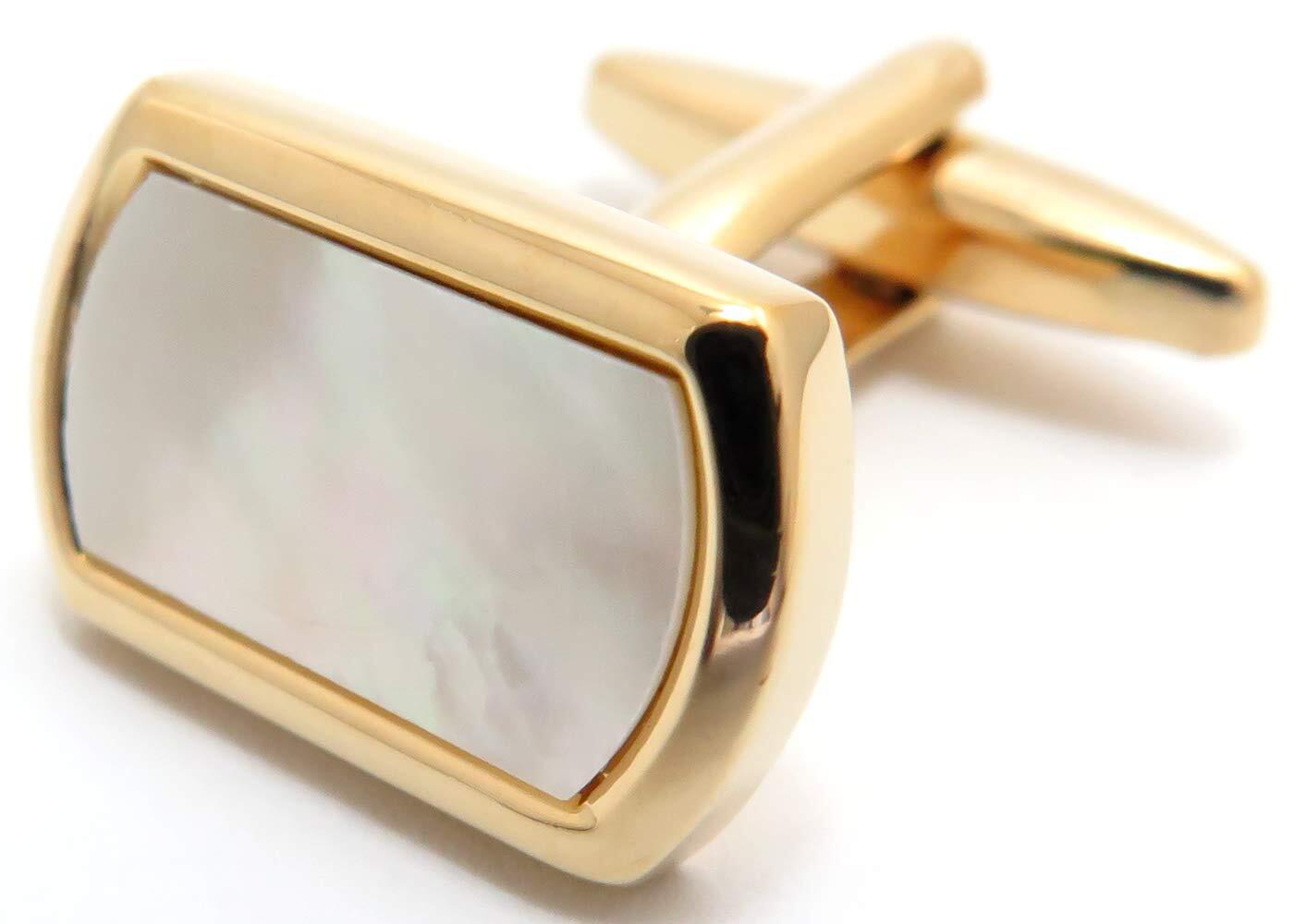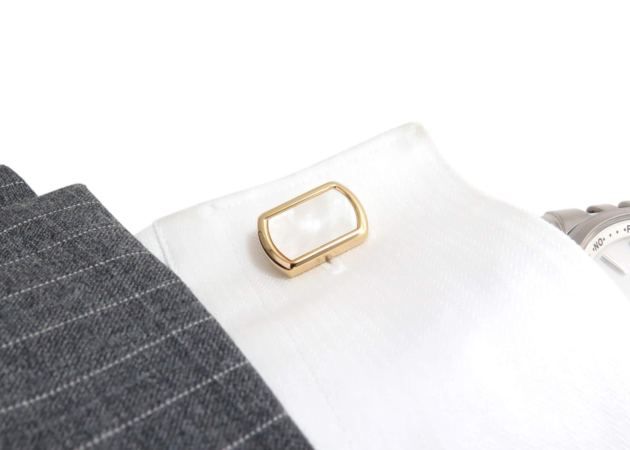 長方形のサイドが丸みを帯びた金メッキの土台に白蝶貝を使用した
